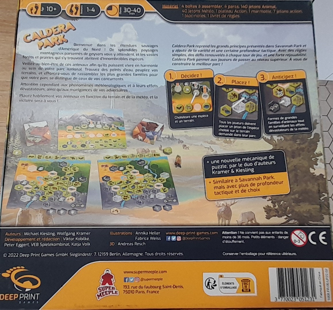 Description : Bienvenue dans les étendues sauvages d’Amérique du Nord ! De splendides paysages montagneux parsemés de geysers vous y attendent, et les vastes forêts et prairies qui s’y trouvent abritent d’innombrables espèces. Veillez au bien-être de ces animaux afin qu’ils puissent vivre en harmonie au sein de votre parc national. Trouvez des points d’eau, peuplez vos terrains, et efforcez-vous de rassembler les plus grandes familles pour que votre parc se distingue de ceux de vos concurrents. Attention cependant aux phénomènes météorologiques et à leurs effets dévastateurs, ainsi qu’aux manigances de vos adversaires… Placez habilement vos animaux en fonction du terrain et de la météo, et la victoire sera à vous !