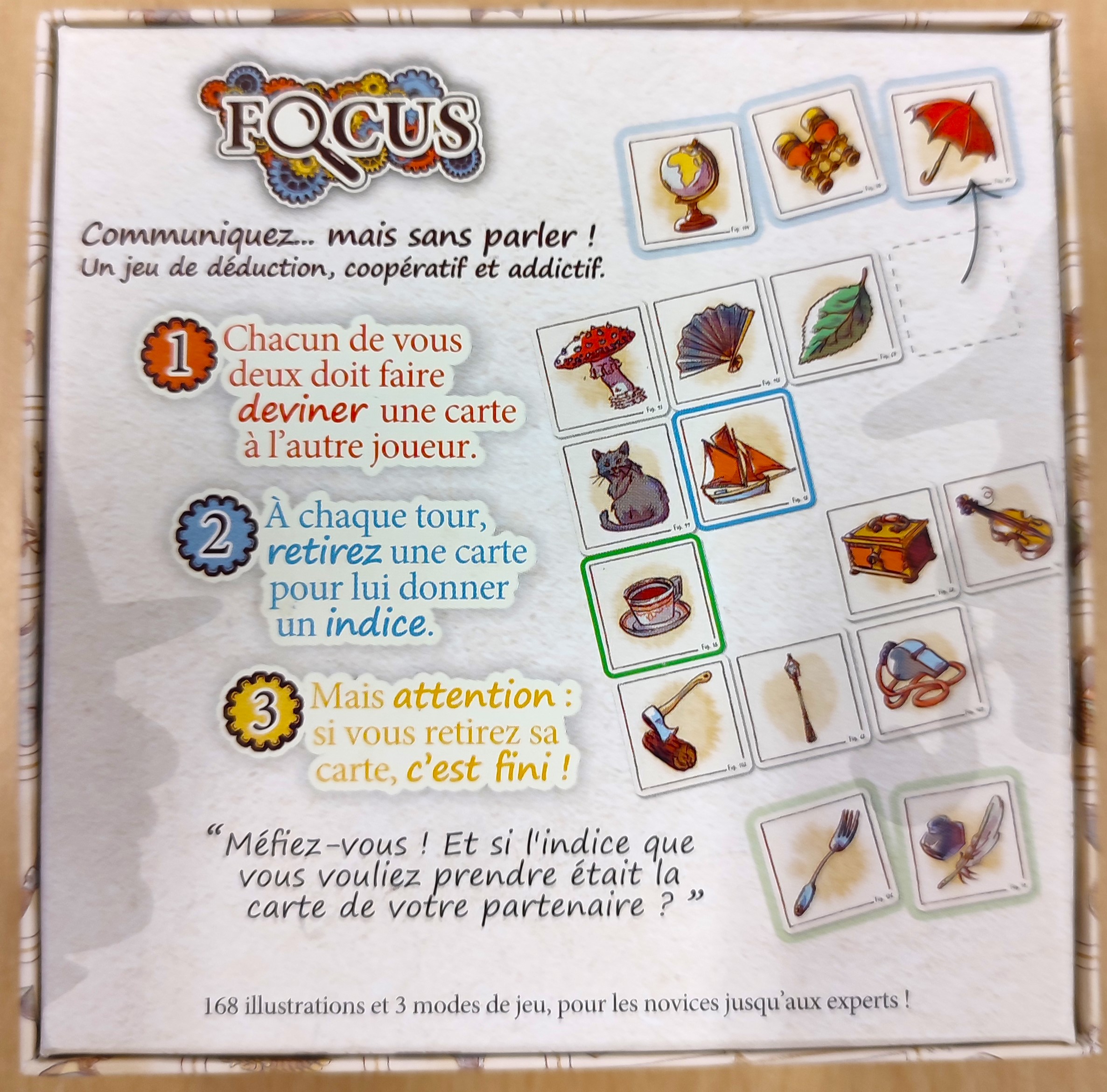 Description : Focus est un jeu d'association d'idées coopératif pour 2 joueurs qui vient apporter une vraie touche de fraicheur ! C'est 168 illustrations et 3 modes de jeux pour les novices jusqu'aux experts., , A mi-chemin entre Codenames Images et Similo, découvrez Focus et emportez-le partout avec vous !