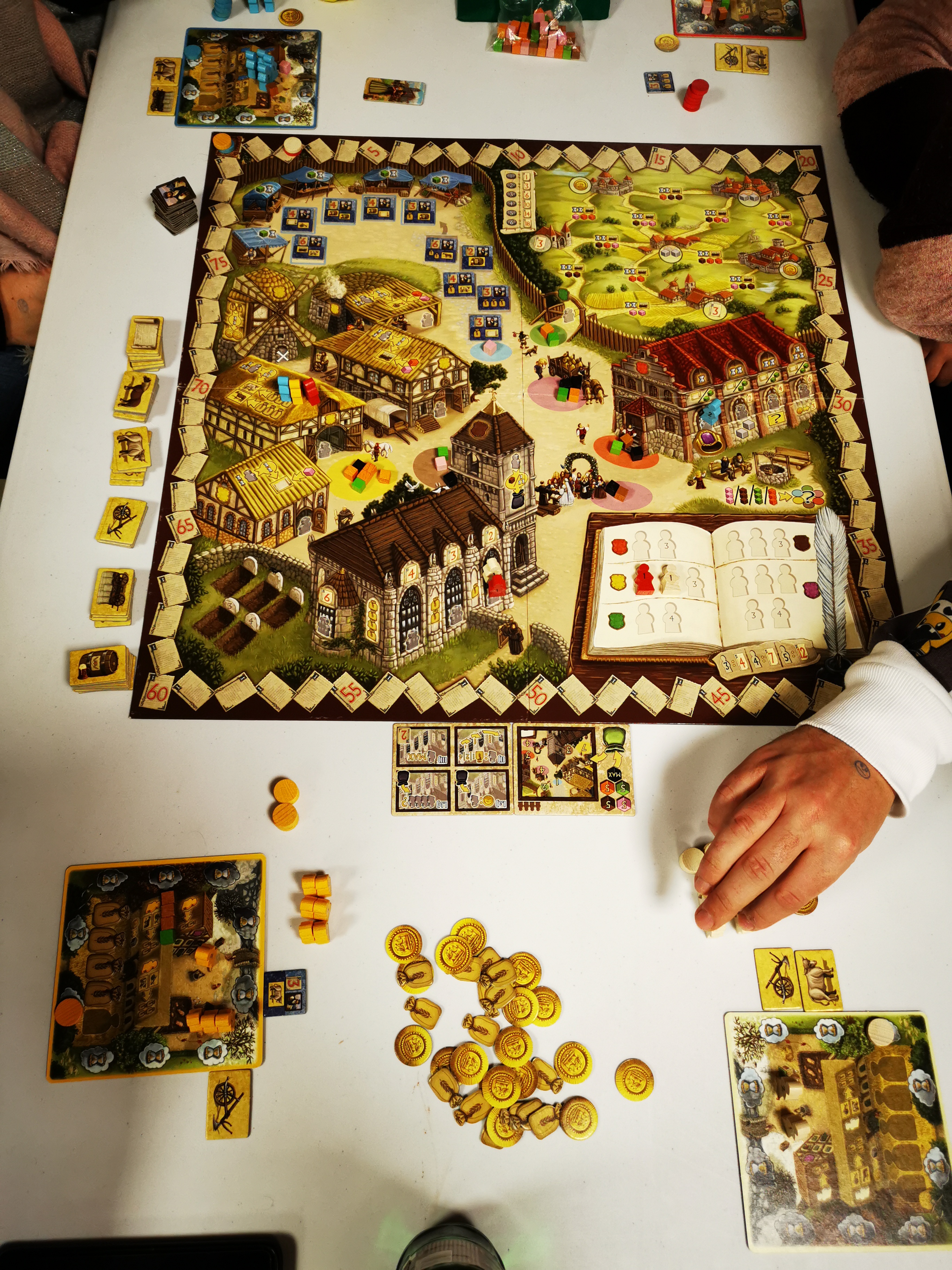 Matériel : 44 membres de familles (11 rouges, 11 jaunes, 11 bleus, 11 blancs), 4 moines noirs, 1 feuille d'autocollants, 32 marqueurs (8 rouges, 8 jaunes, 8 bleus, 8 blancs), 6 cubes Peste, 1 marqueur Premier Joueur, 1 marqueur Prochain Premier Joueur, 72 cubes d'influence (18 bruns, 18 roses, 18 oranges, 18 verts), 2 sacs en tissus (1 vert, 1 noir), 40 tuiles Marchandise (8 parchemins, 8 chevaux, 8 charrues, 8 bœufs, 8 chariots), 4 Fermes, 1 plateau de jeu, 24 tuiles Client recto verso, 15 pièces, 20 sacs de grains, 3 cartes Mise en place (pour 2, 3, 4 joueurs), 1 carte de Résumé de la Messe.