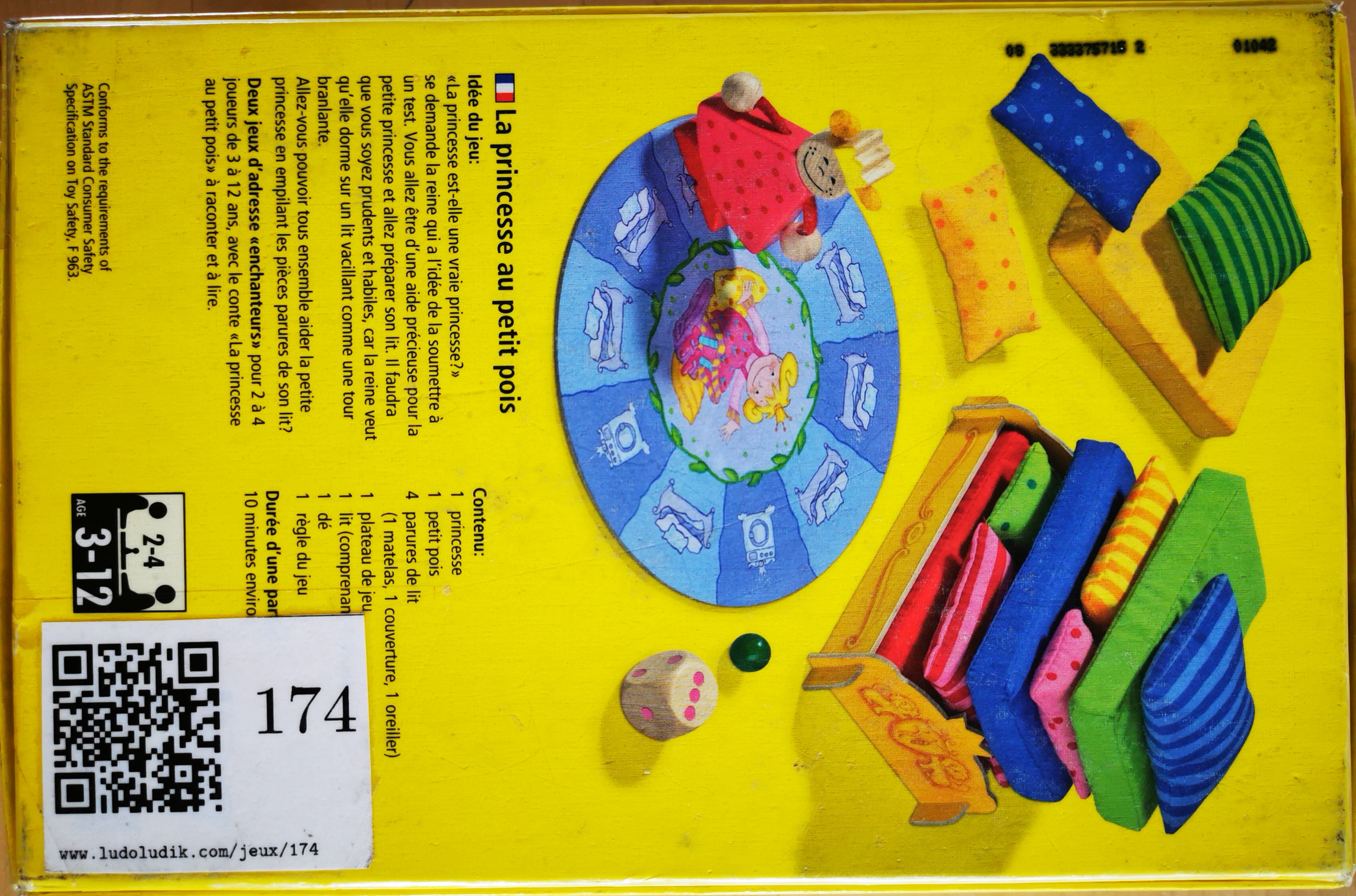 Matériel : 1 règle du jeu, 4 matelas, 8 coussins (4 couvertures, 4 oreillers), 1 plateau, 1 cadre-lit, 1 princesse, 1 petit pois, 1 dé.