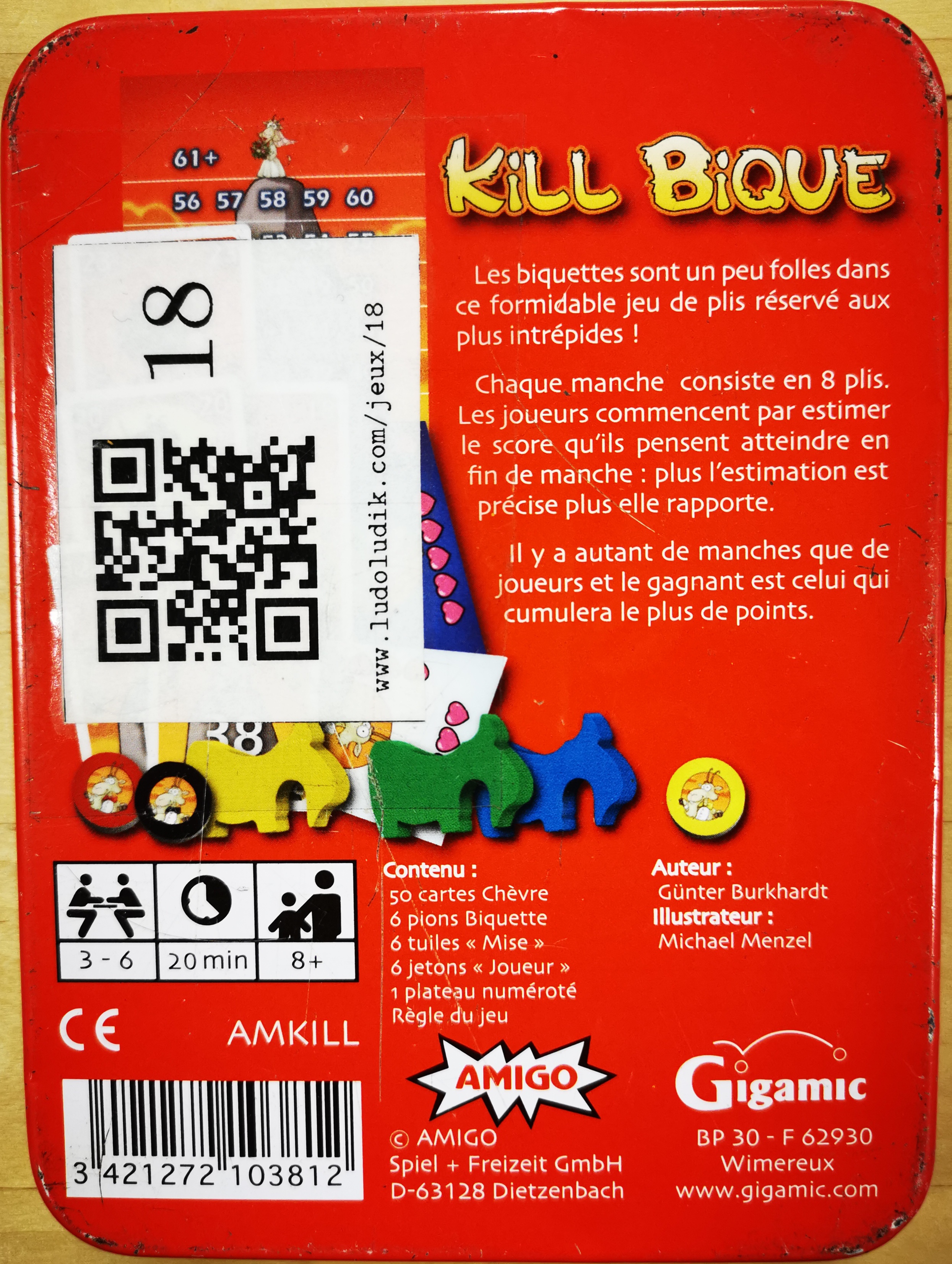 Matériel : 1 règle du jeu, 50 cartes, 1 plateau numéroté, 6 pions "biquettes", 6 tuiles "mises", 6 jetons "joueurs"