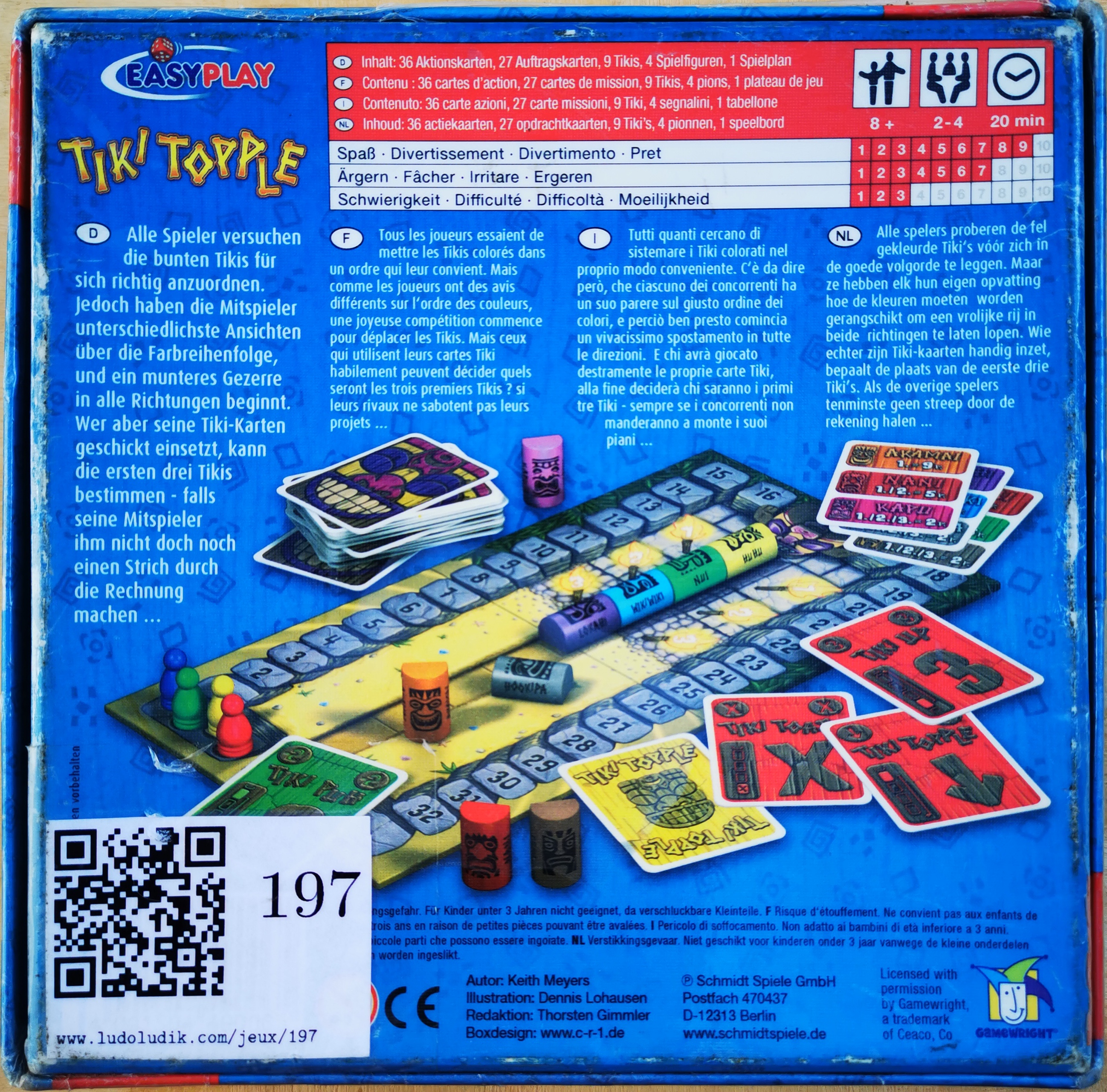 Matériel : 1 règle du jeu, 9 Tikis, 4 pions, 1 plateau, 27 cartes de mission, 36 cartes actions