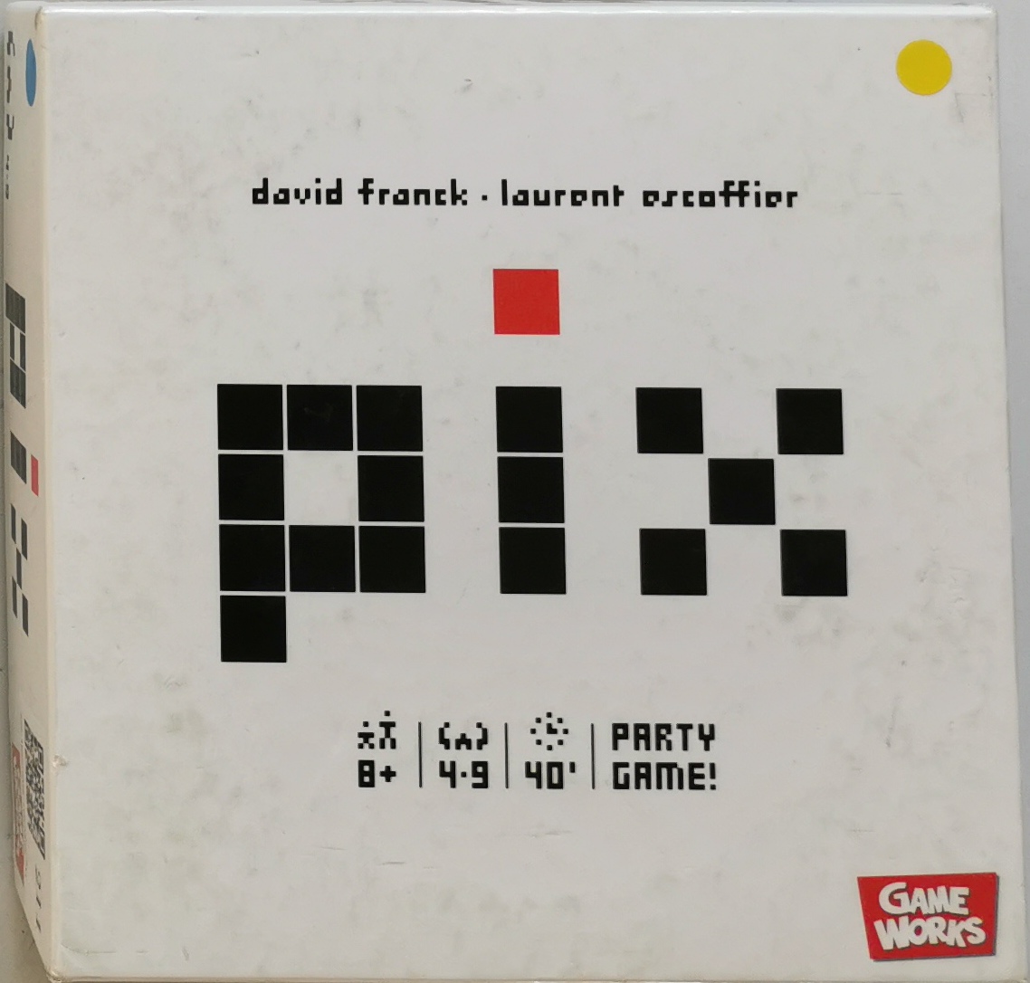 Matériel : 1 règle du jeu, 9 écrans, 230 cartes, 208 pixels noirs, 9 pixels rouges, 9 flèches rouges, 36 cubes, 1 sablier