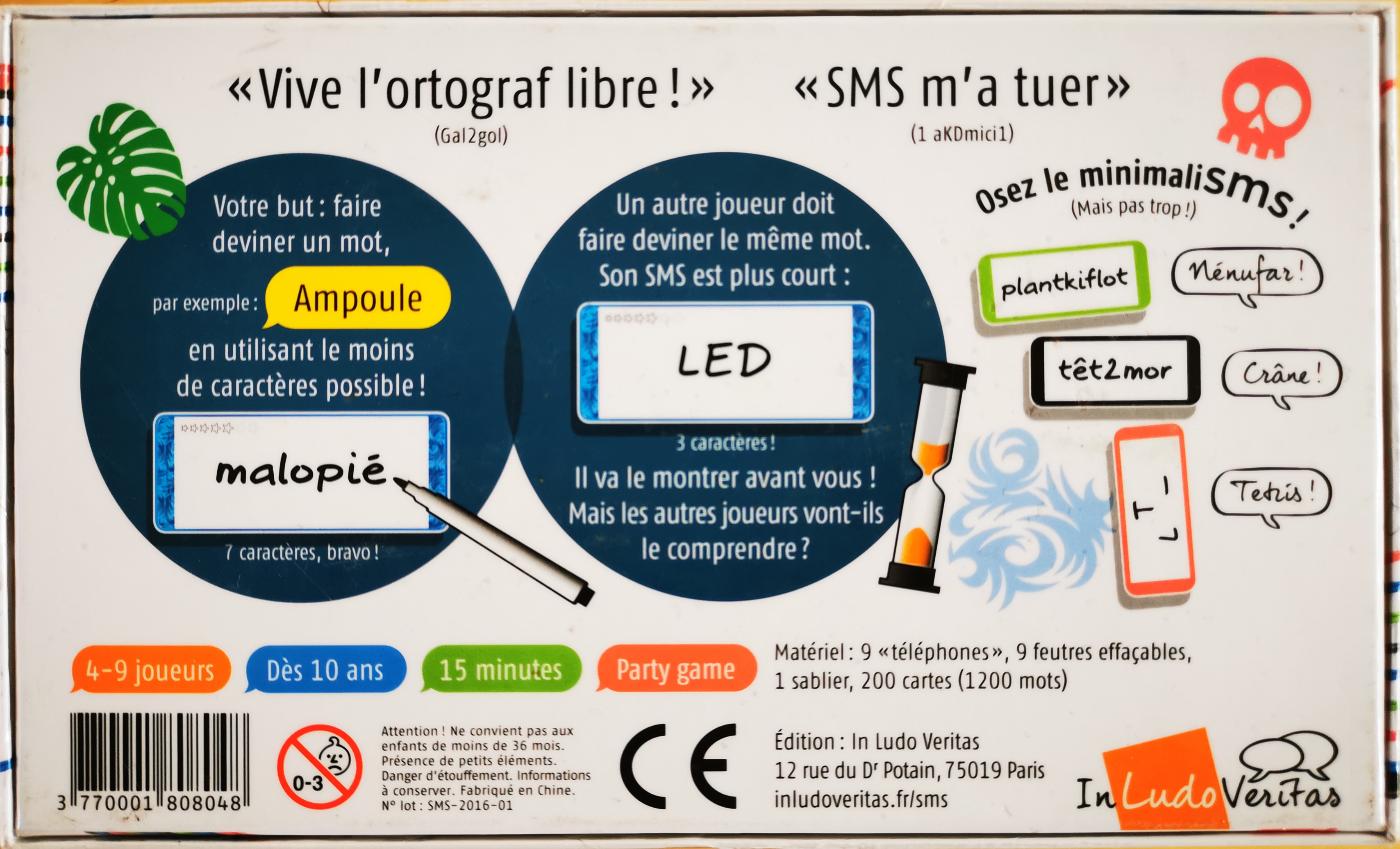 Matériel : 9 "téléphones", 9 feutres effaçables, 200 cartes (1200 mots), 1 sablier, 1 livret de règles.