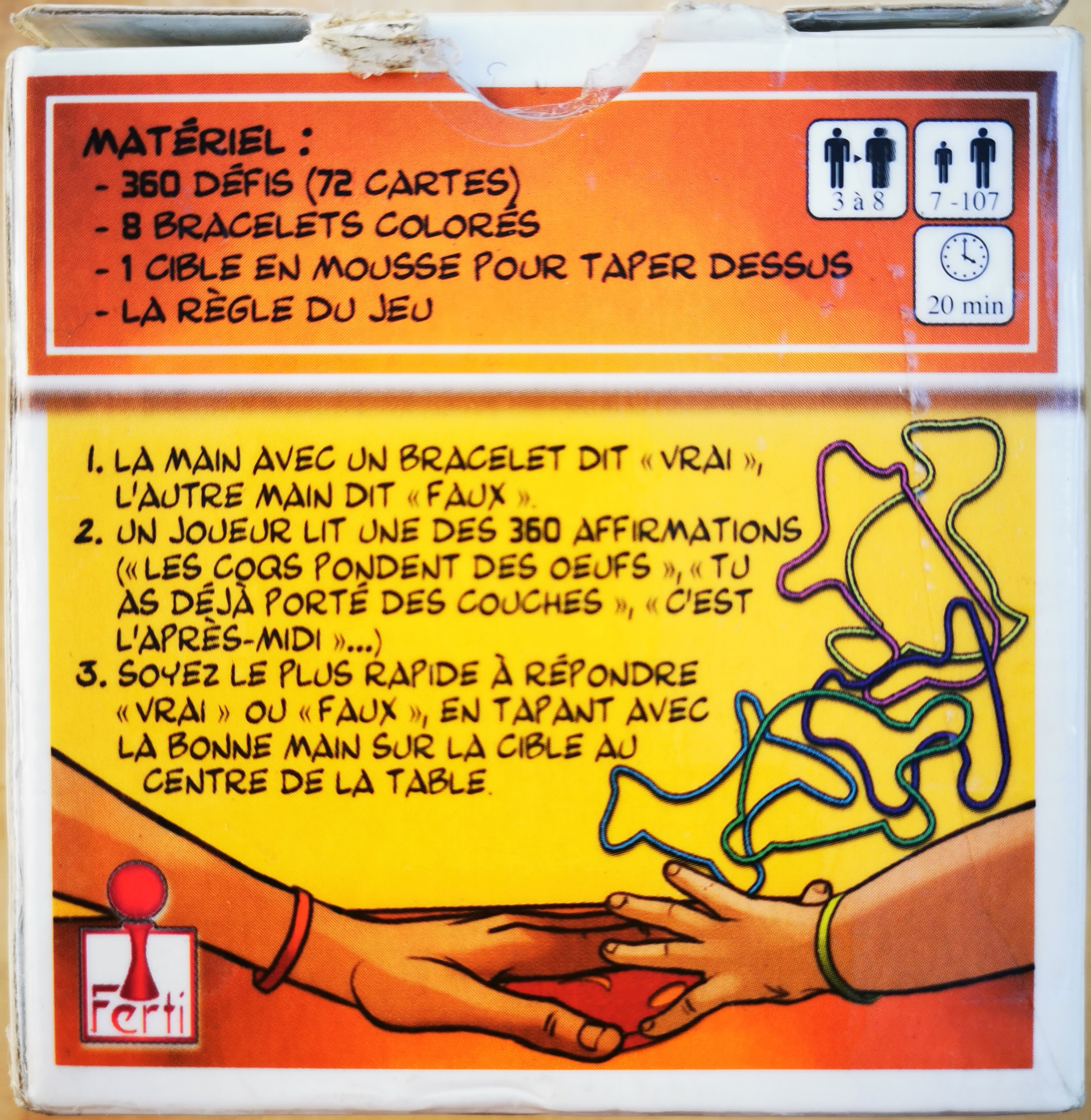 Matériel : 1 règle du jeu, 72 cartes, 1 cible en mousse , 8 bracelets.