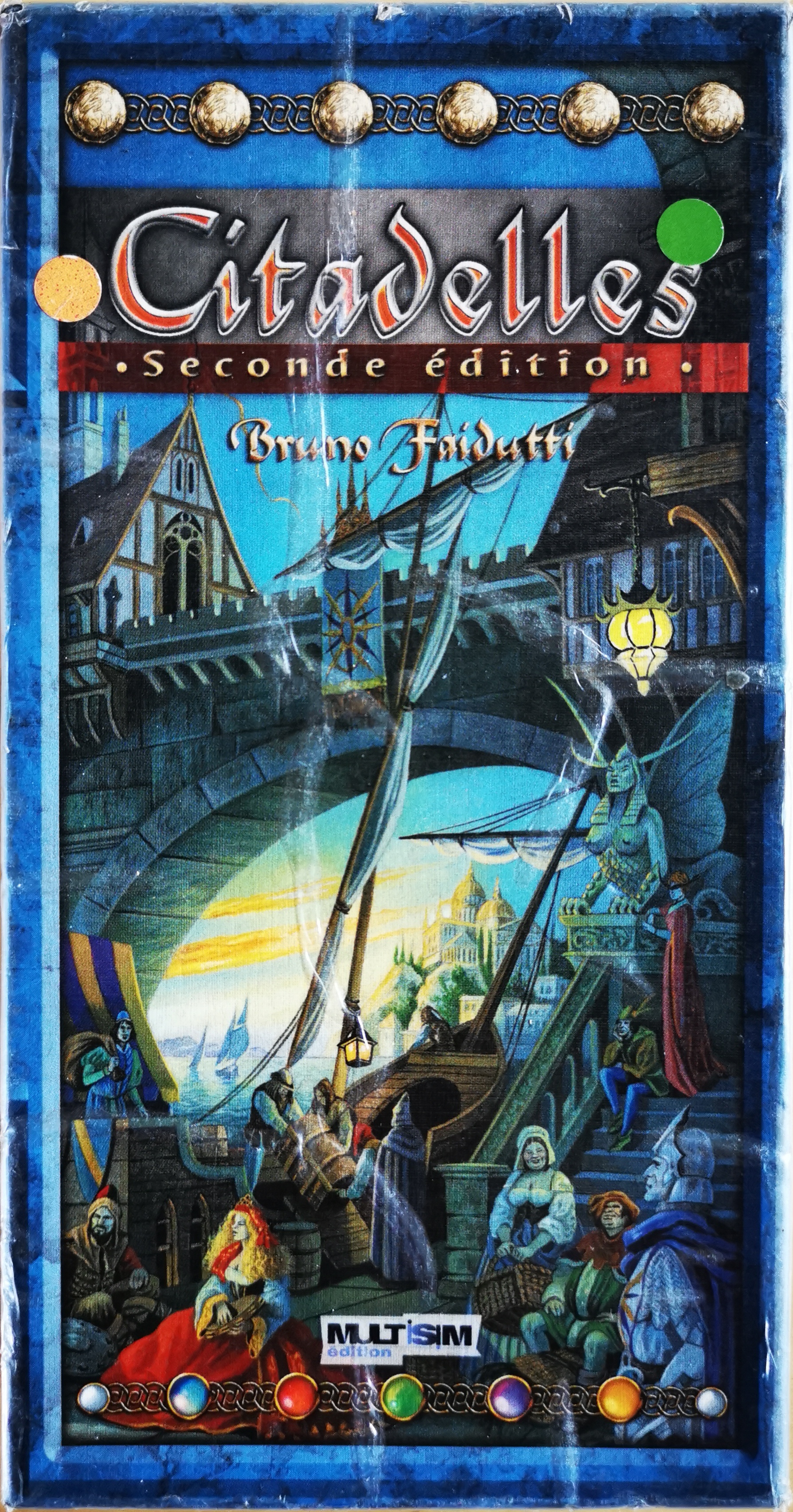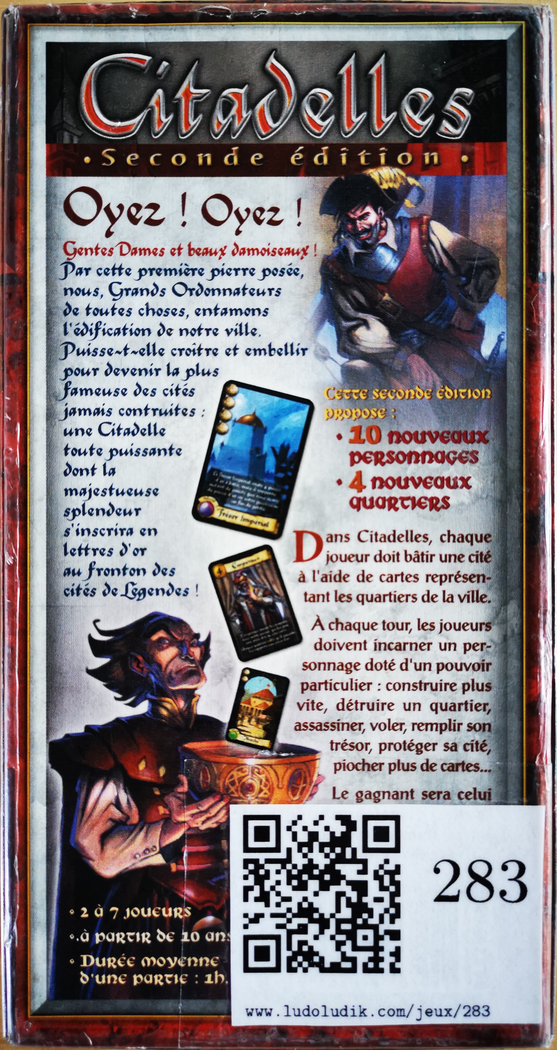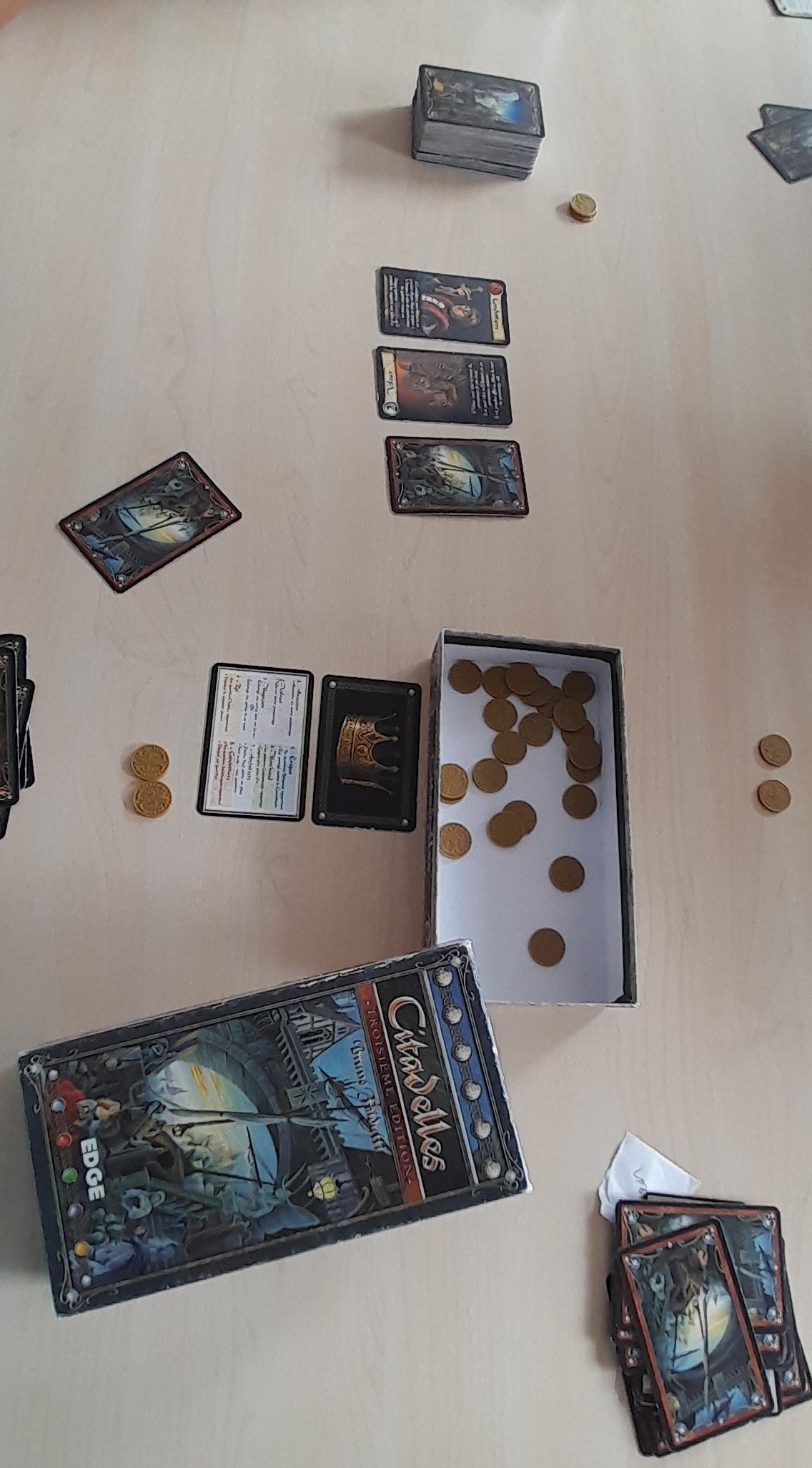Matériel : 25 pièces d'or, 7 cartes aide de jeu, 71 cartes quartiers, 1 carte couronne, 18 cartes personnages.