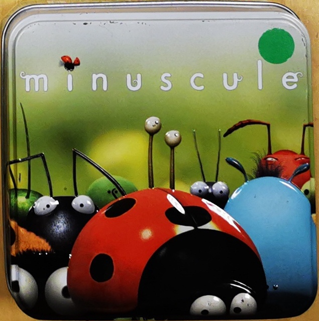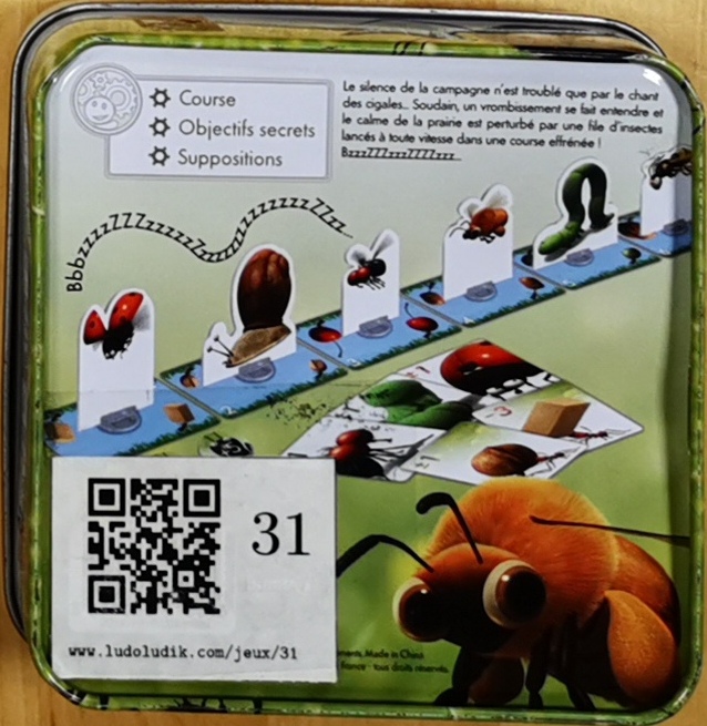 Matériel : 1 règle du jeu, 34 cartes déplacement, 14 cartes objectifs, 3 pions fourmis, 7 cartes pistes, 7 insectes + 8 socles