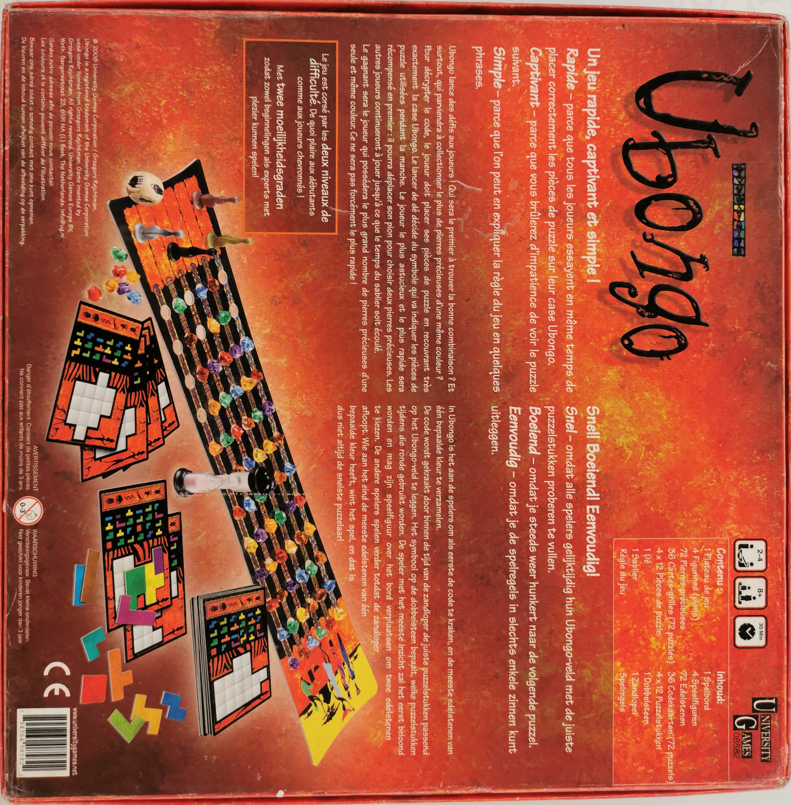 Matériel : 1 règle du jeu, 1 plateau, 4 figurines, 72 pierres, 36 cartes-grilles, 48 pièces de puzzle, 1 dé