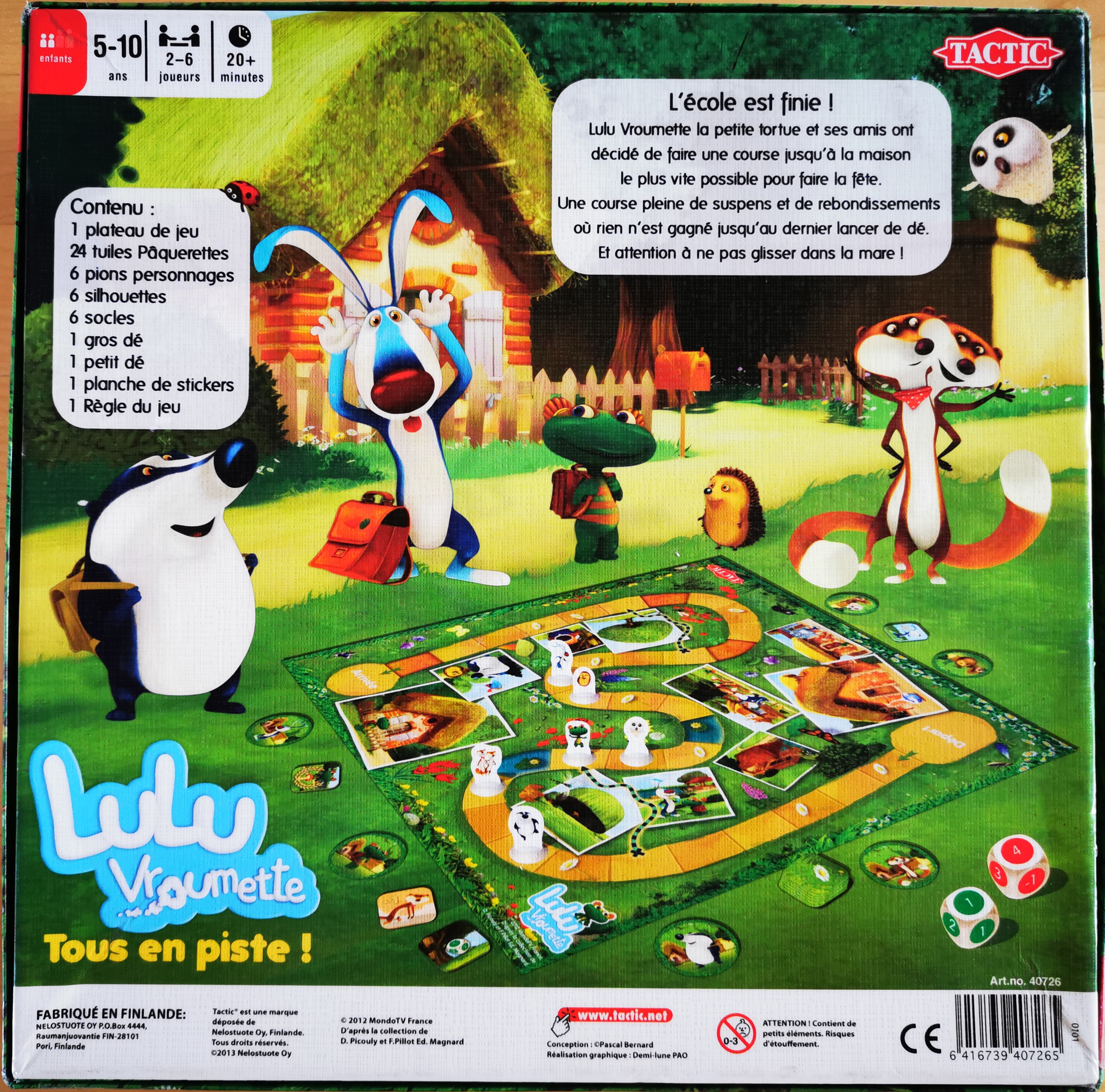 Matériel : 1 règle du jeu, 1 plateau, 18 jetons pâquerettes (détaillés dans la règle), 6 pions ronds personnages, 6 silhouettes avec 6 socles, 1 gros dé (-1,-1,2,3,3,4), 1 petit dé (1,1,1,2,2,2).