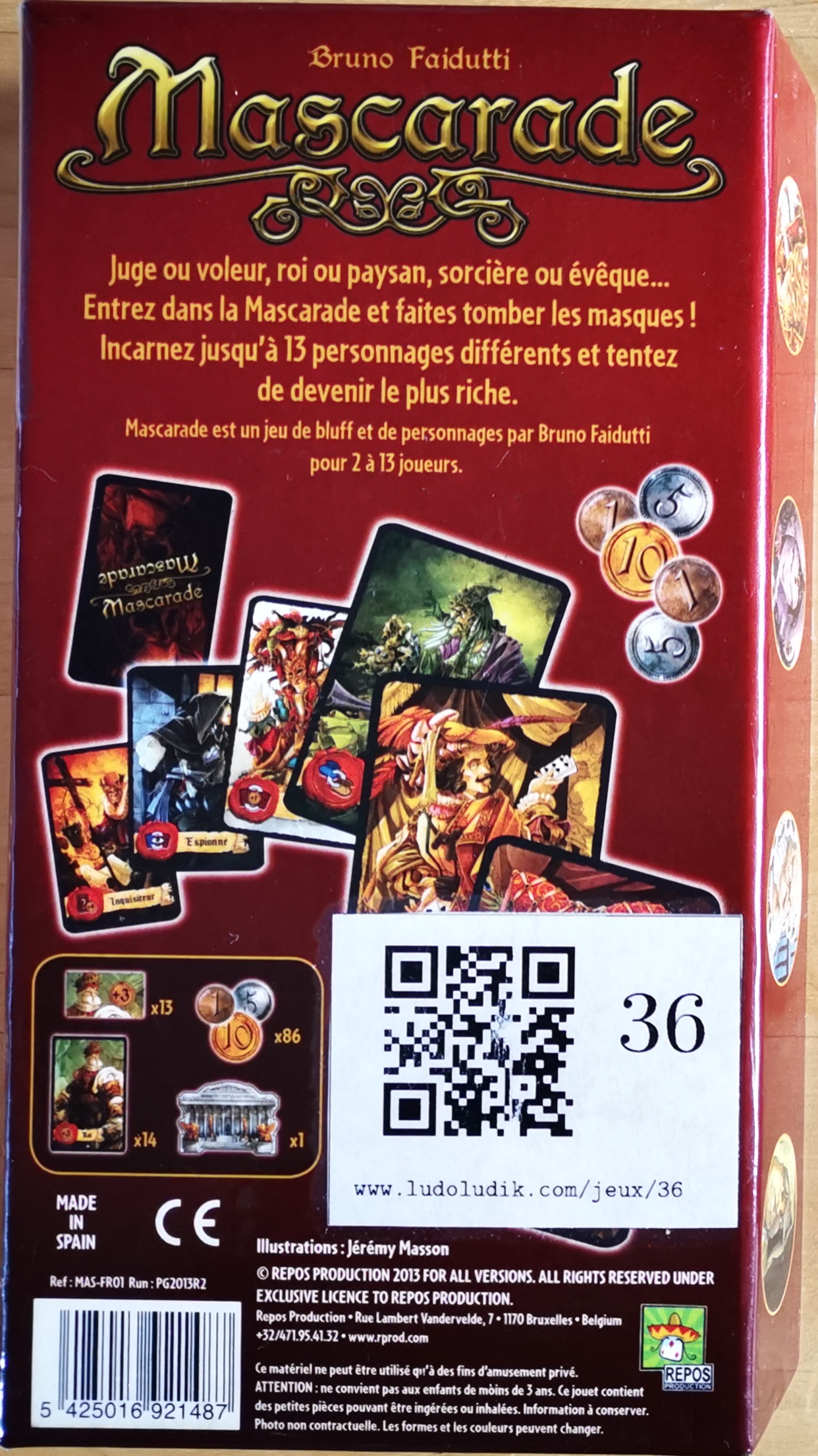 Matériel : 1 règle du jeu, 14 cartes personnages, 1 carte personnage vierge, 1 plateau, des pièces dont la somme est de 194 pièces d'or, 13 marqueurs personnage.