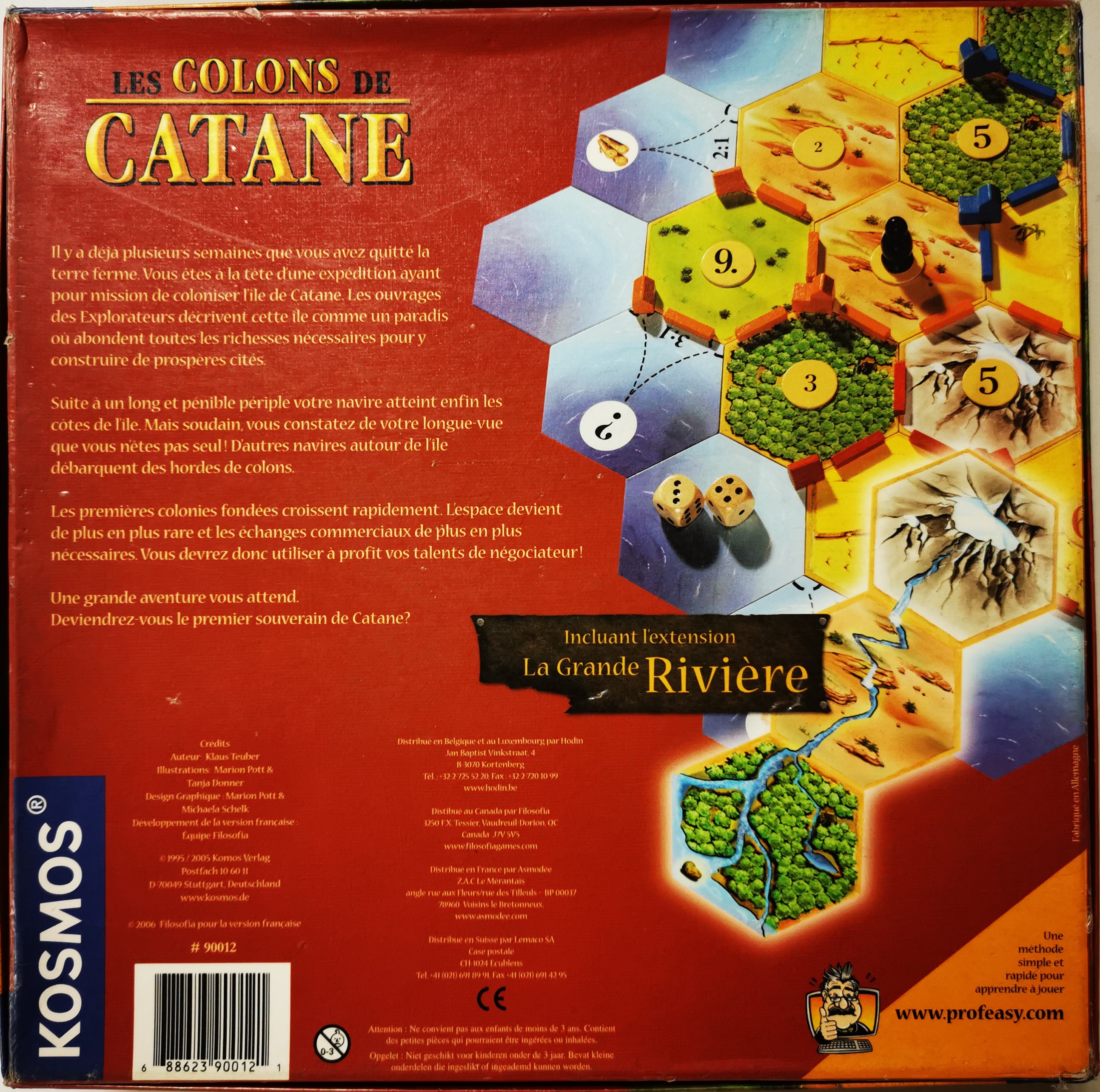 Règle : 1 règle du jeu, 19 tuiles "terrain", 18 tuiles "maritime", 6 fiches cartonnées, 25 cartes "développement", 18 jetons "numérotés", 96 pions de construction rouges, 2 dés, 95 cartes "ressources", 1 pion "voleur"
