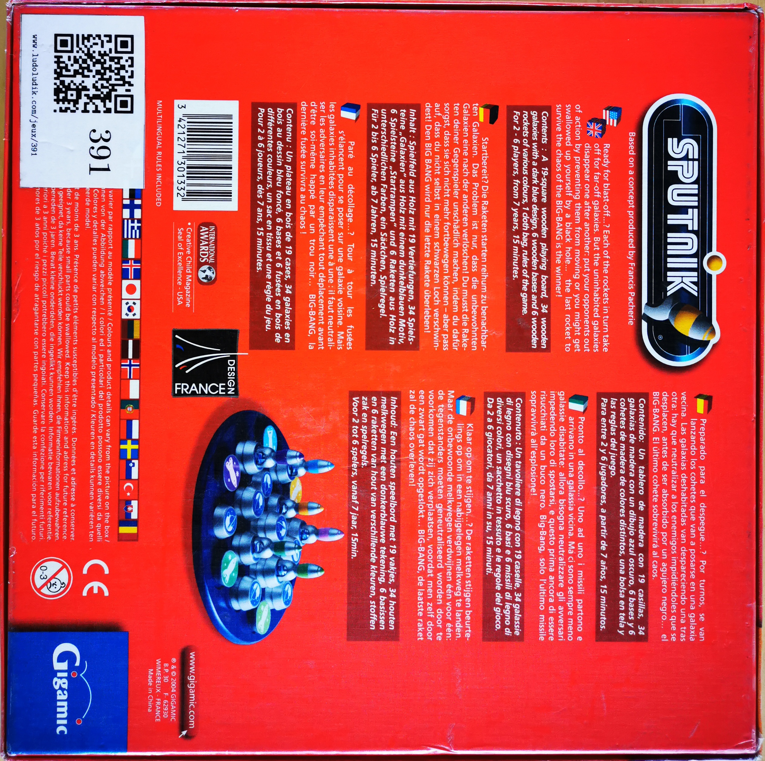 Matériel : 1 règle du jeu, 1 plateau en bois, 6 fusées et leur 6 bases en bois, 34 galaxies en bois, 1 sac de rangement.