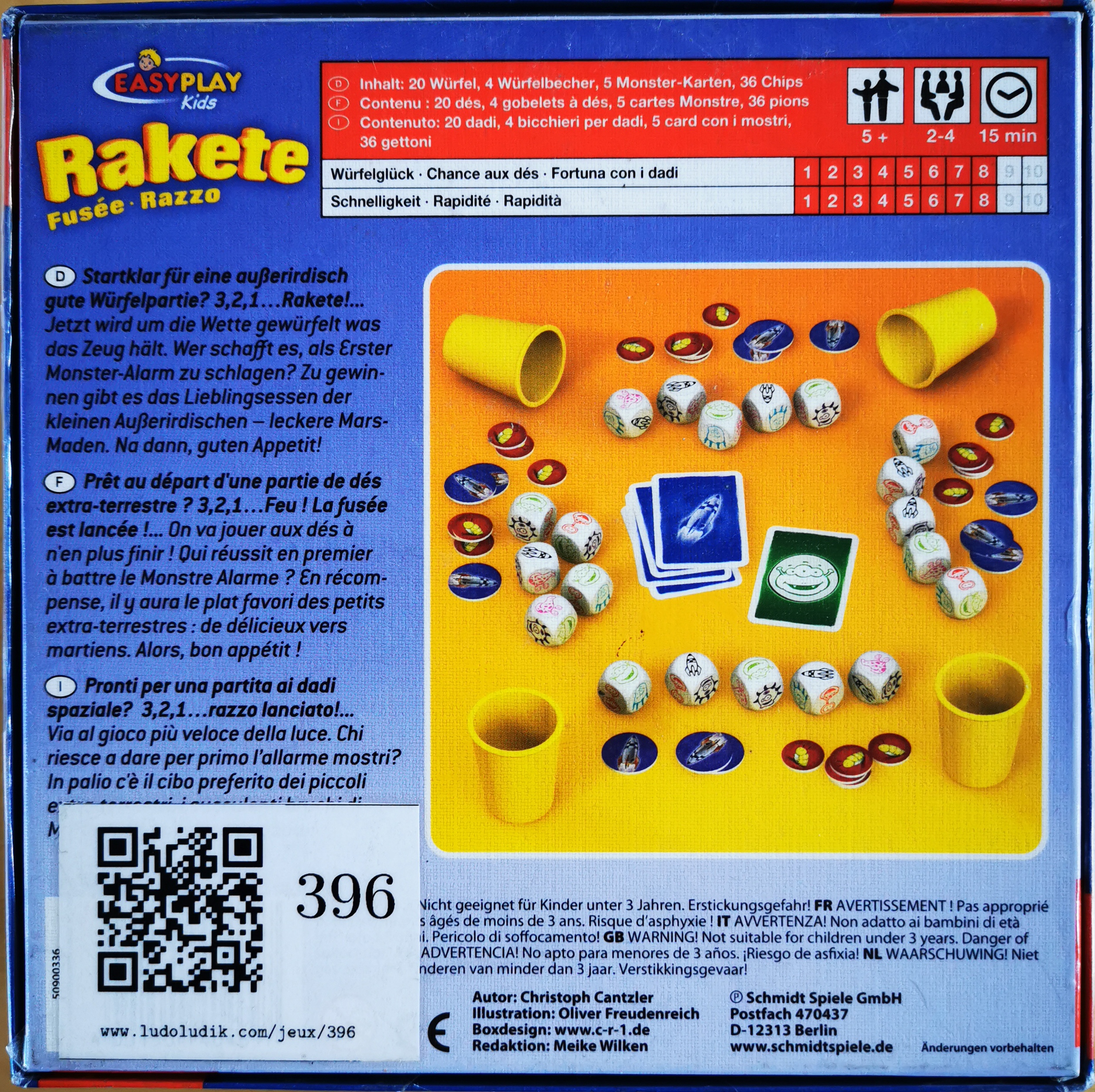 Matériel : 1 règle du jeu, 20 dés, 4 gobelets jaunes, 5 cartes "monstre", 24 pions "vers", 12 pions "fusée".