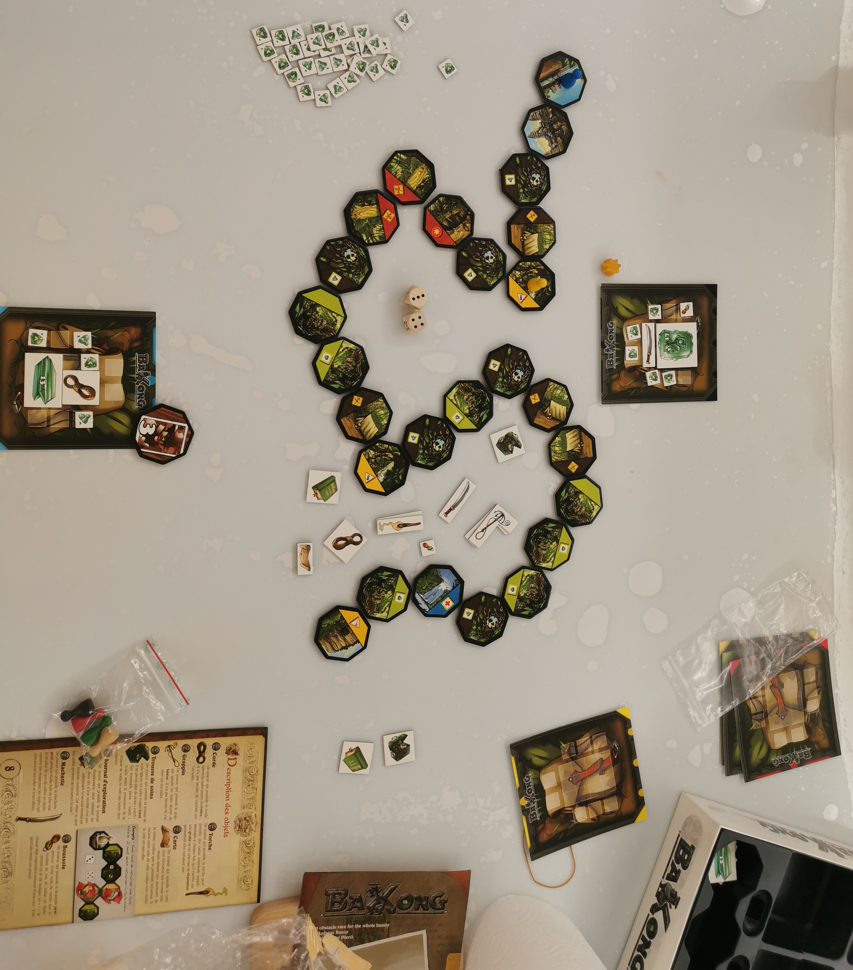 Matériel : 24 tuiles jungle, 1 tuile campement, 1 tuile temple, 6 plateau sac à dos, 6 pions aventuriers, 2 dés,, 6 grosses émeraudes (x1), 19 petites émeraudes (x3), 20 petites émeraudes (x1), 12 pions "outch",, 2 séries de 8 objets, 1 tuile "premier arrivé"