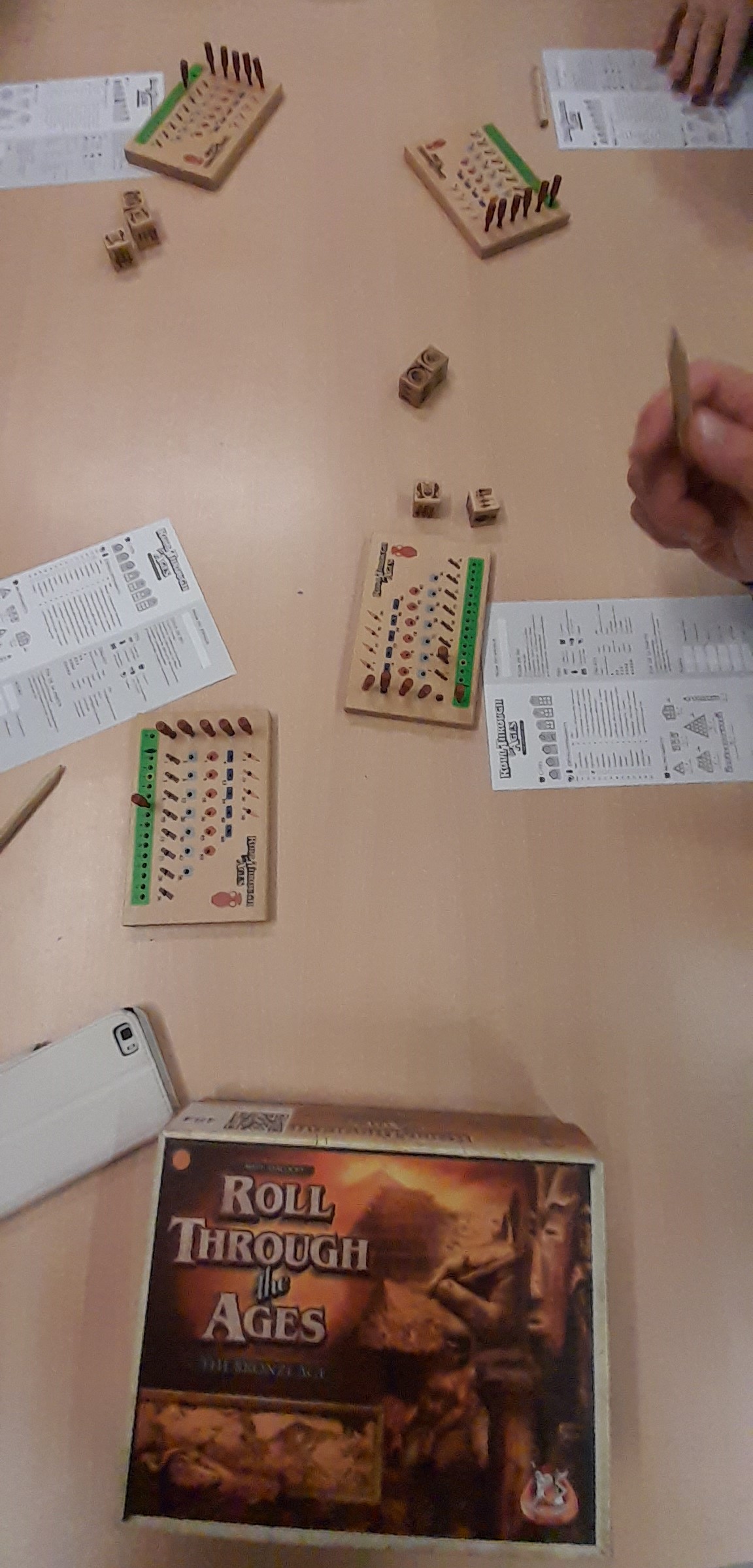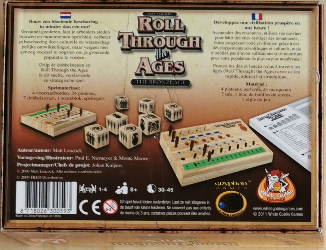 Matériel : 1 règle du jeu, 4 plateaux , 1 bloc de feuilles de score, 24 marqueurs en bois, 7 dés