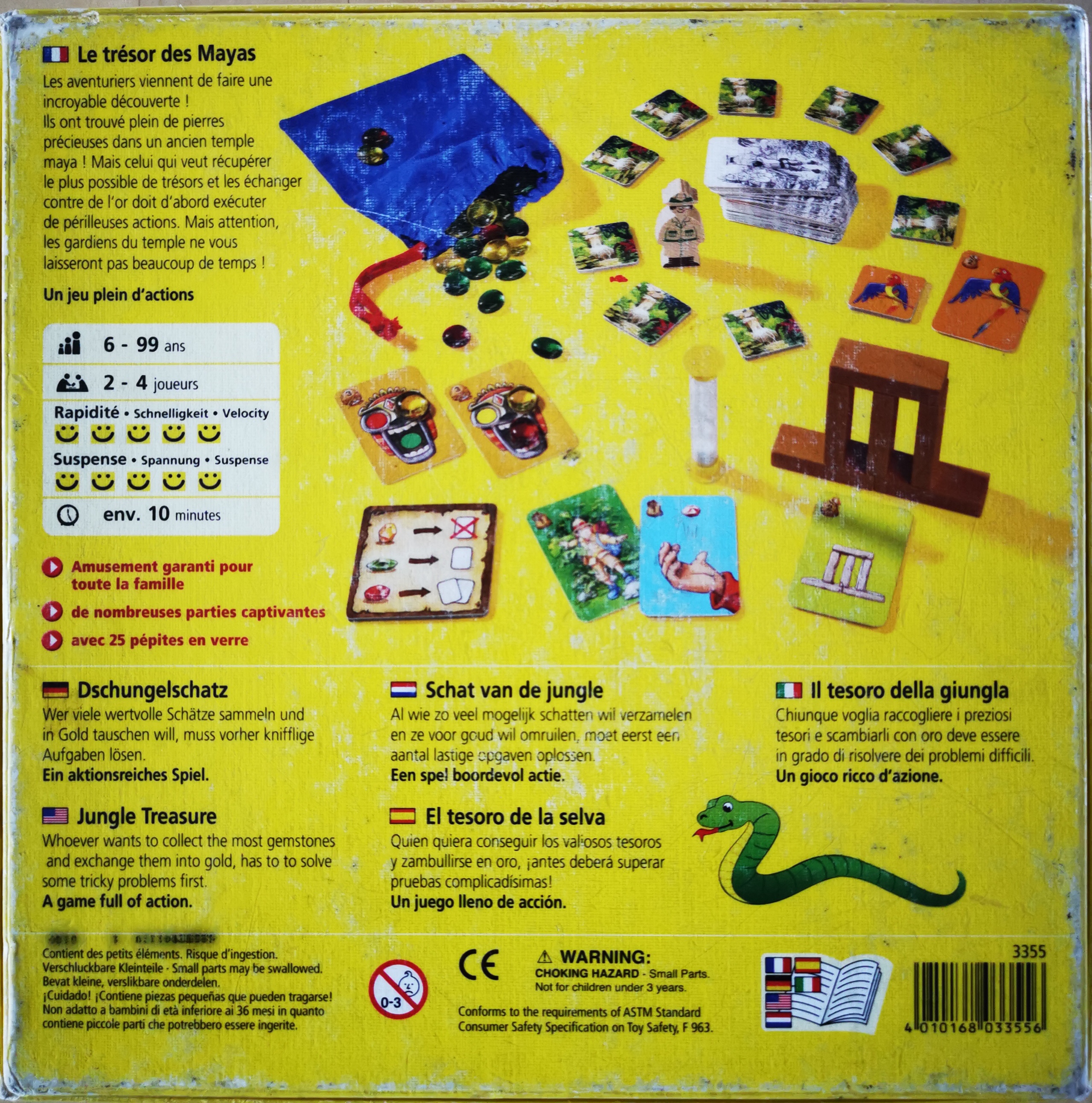 Matériel : 1 règle du jeu, 1 sablier, 1 pion "aventurier", 10 plaquettes carrées, 74 cartes, 6 blocs marrons, 1 fiche récapitulative, 1 sac en tissu, 25 pierres précieuses (12 jaunes, 8 vertes, 5 rouges)