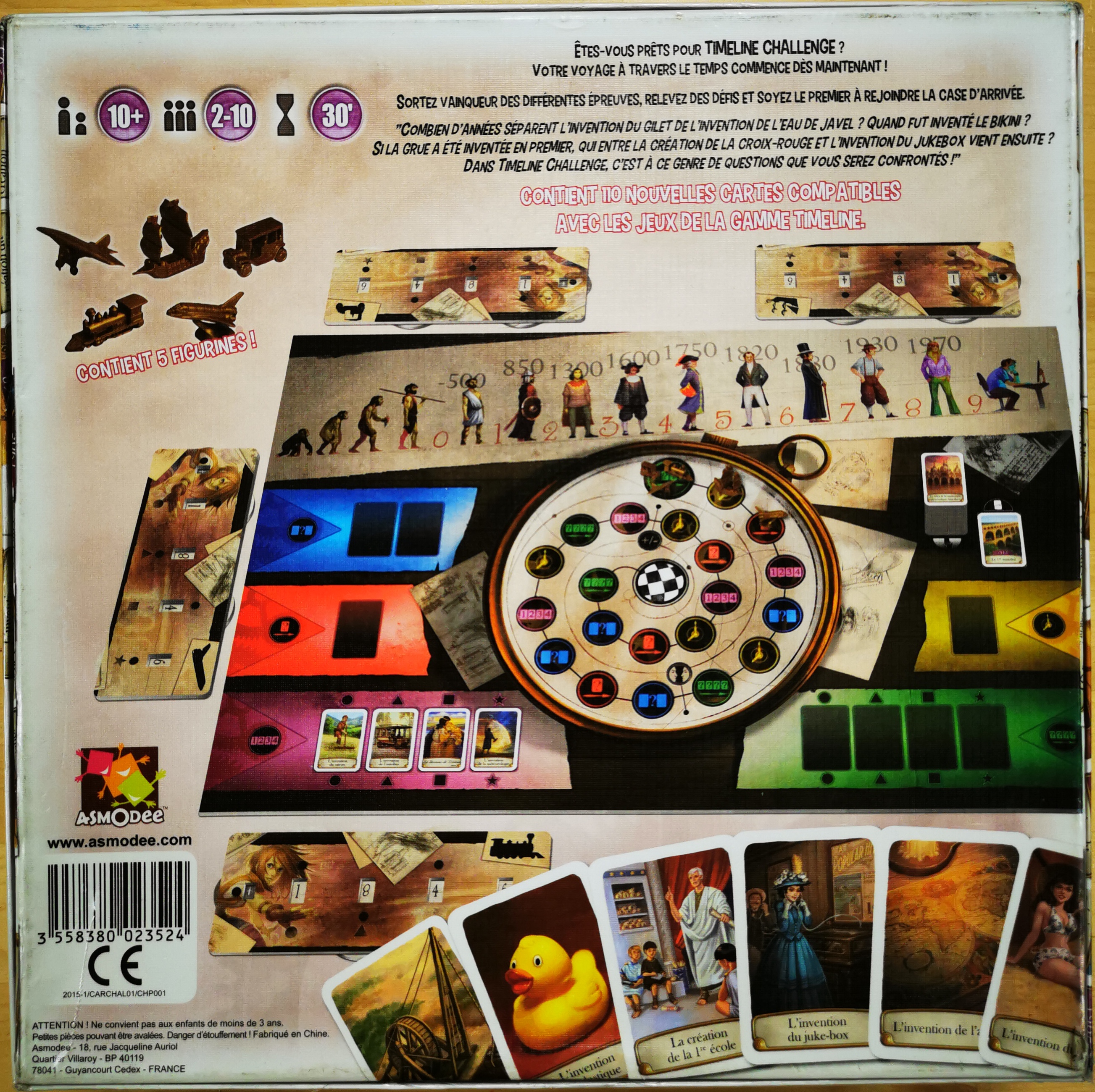 Matériel : 1 règle du jeu, 1 plateau, 5 aides de jeu, 5 pions "voyageur", 5 tableaux temporels", 110 cartes, 4 jetons numérotés.