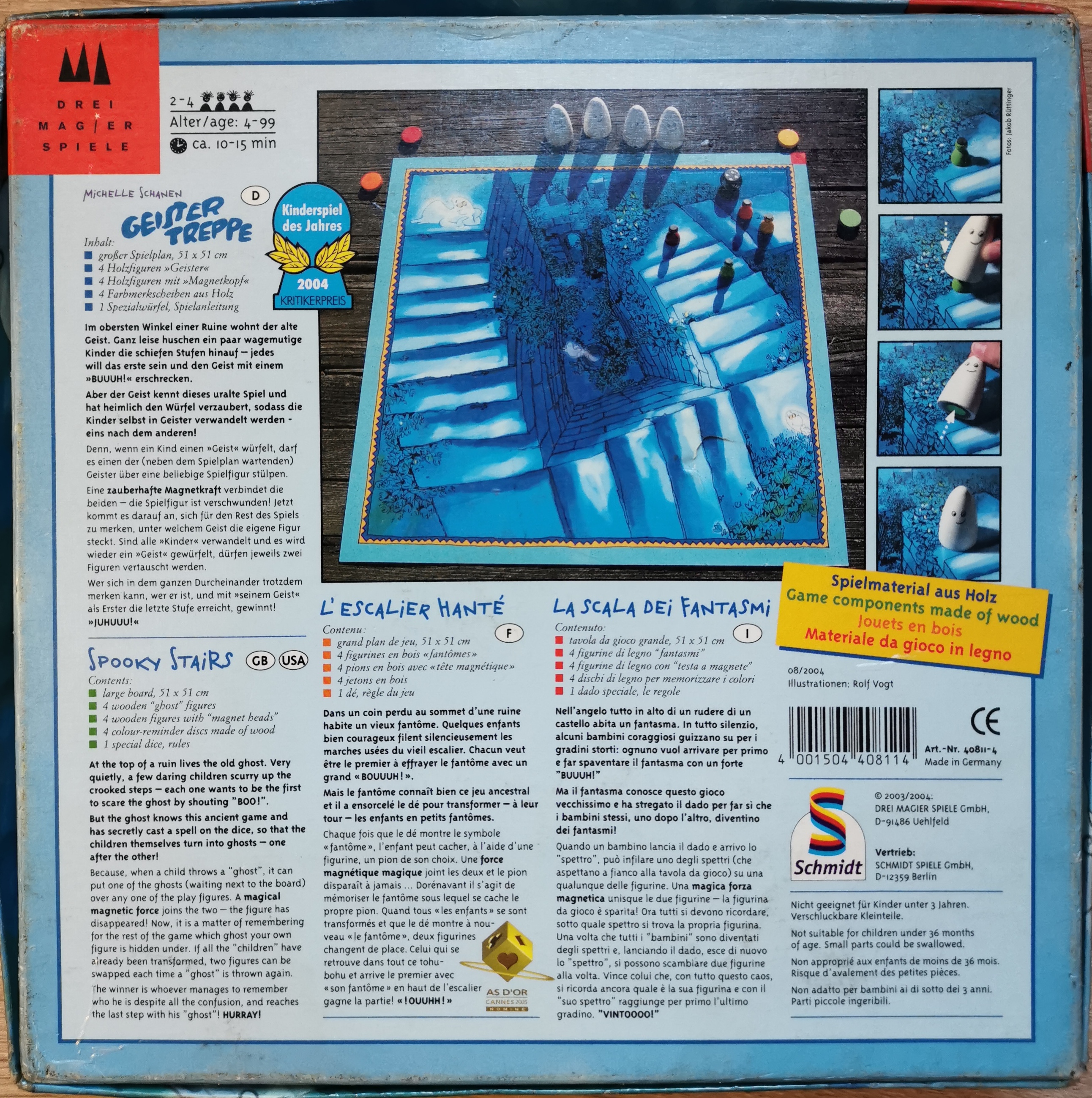 Matériel : 1 règle du jeu, 1 plateau, 4 figurines fantôme, 4 pions enfants en bois, 4 jetons couleurs en bois, 1 dé spécial.