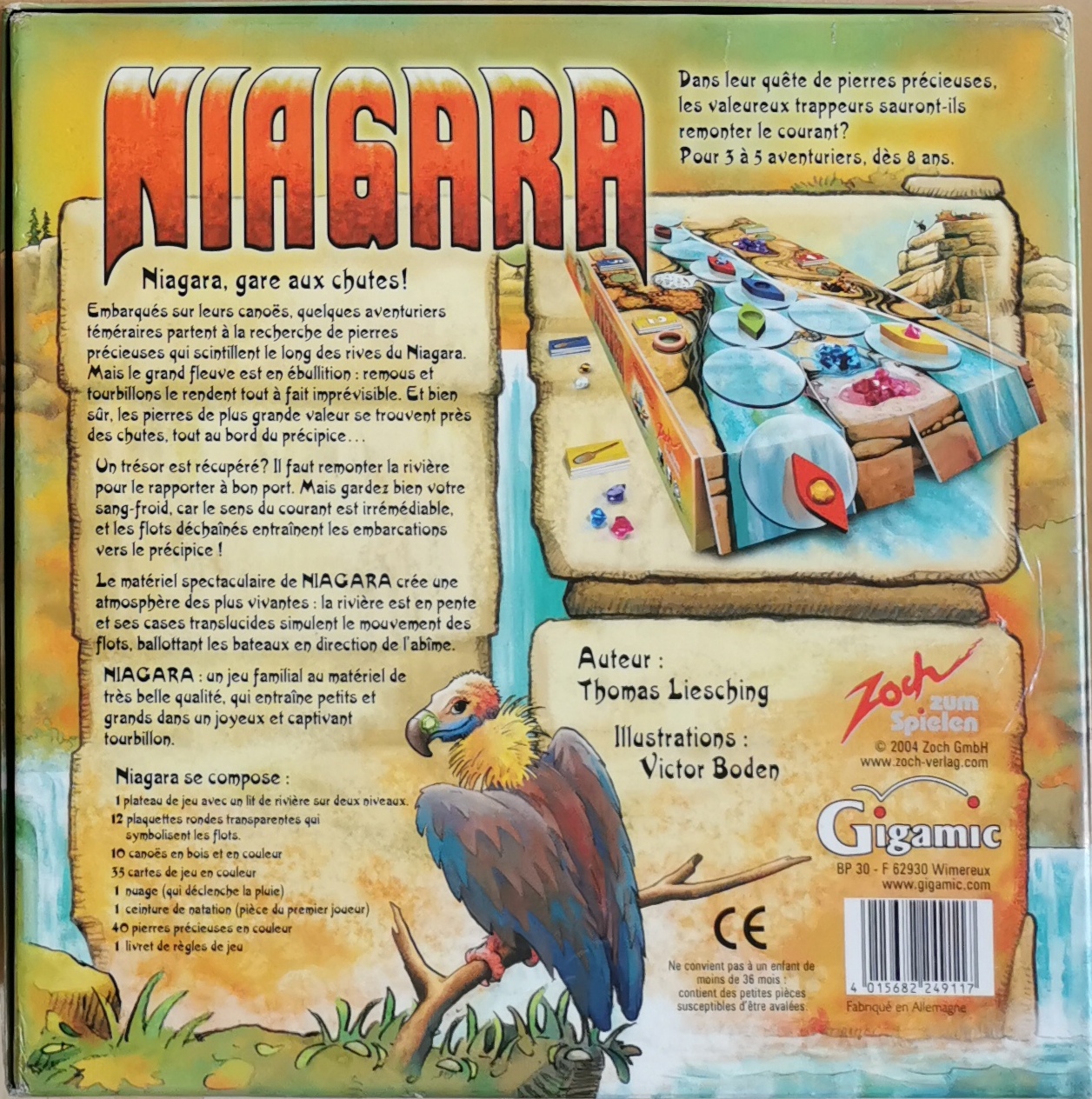 Matériel : 1 règle du jeu, 1 plateau de jeu, 10 canoës, 1 anneau marron, 1 nuage, 40 pierres précieuses, 35 cartes