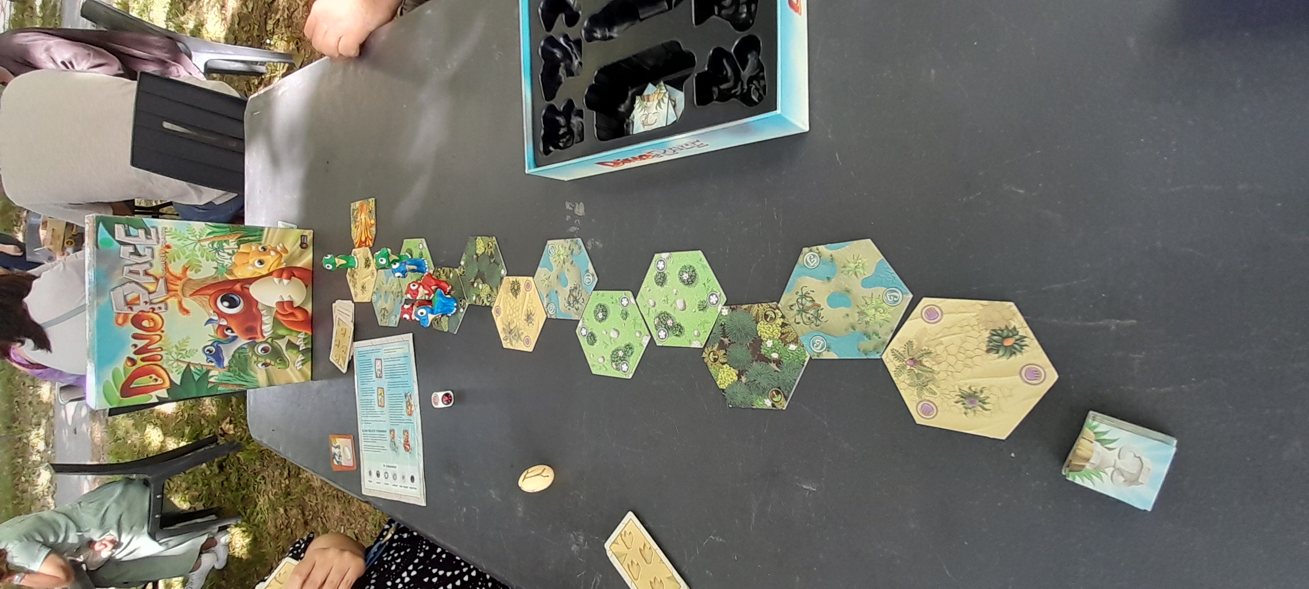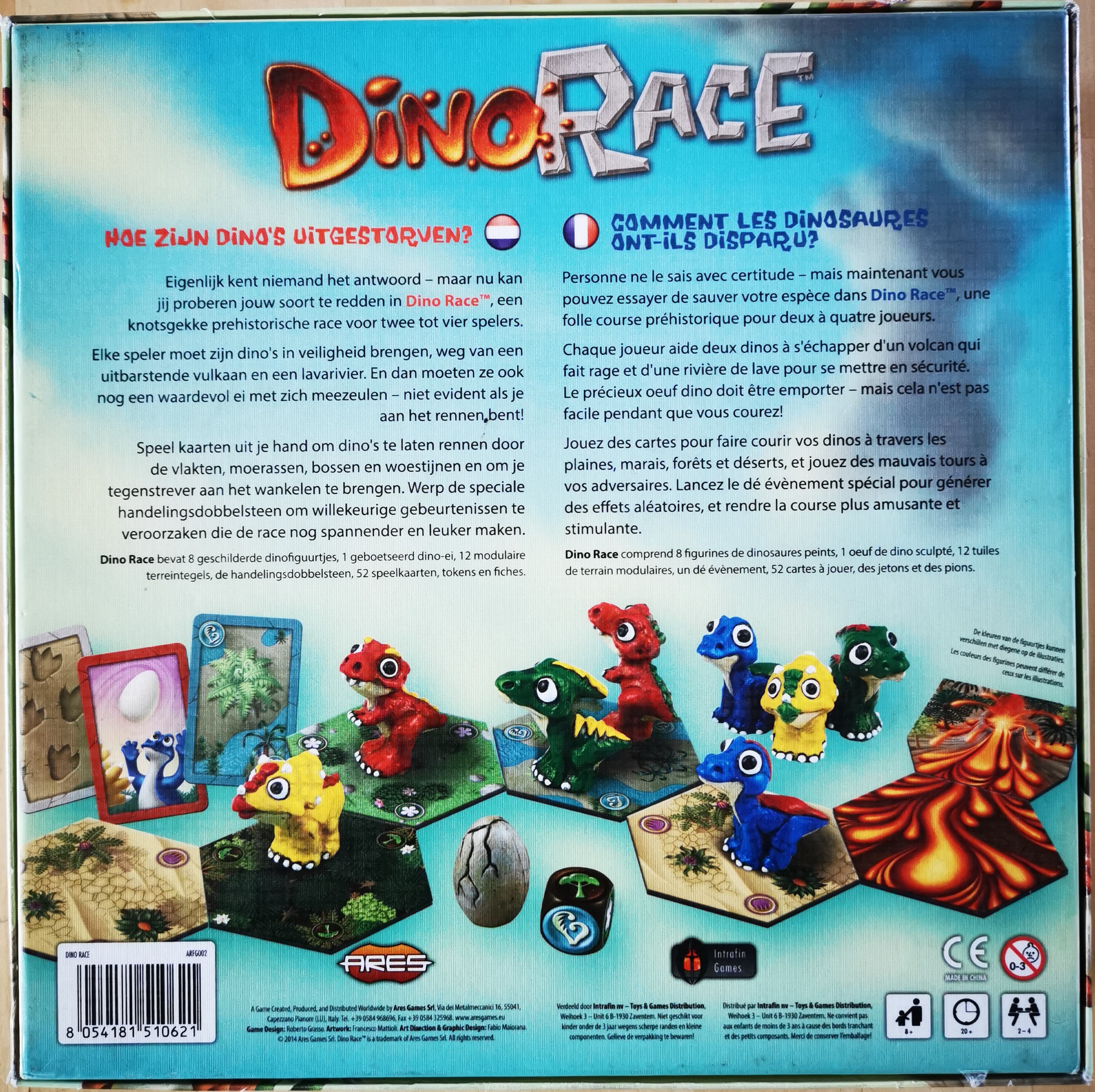 Matériel : 8 figurines de dinosaures peints, 1 oeuf de dino sculpté, 12 tuiles de terrain modulaires, 1 dé évènement, 52 cartes à jouer, des jetons et des pions.