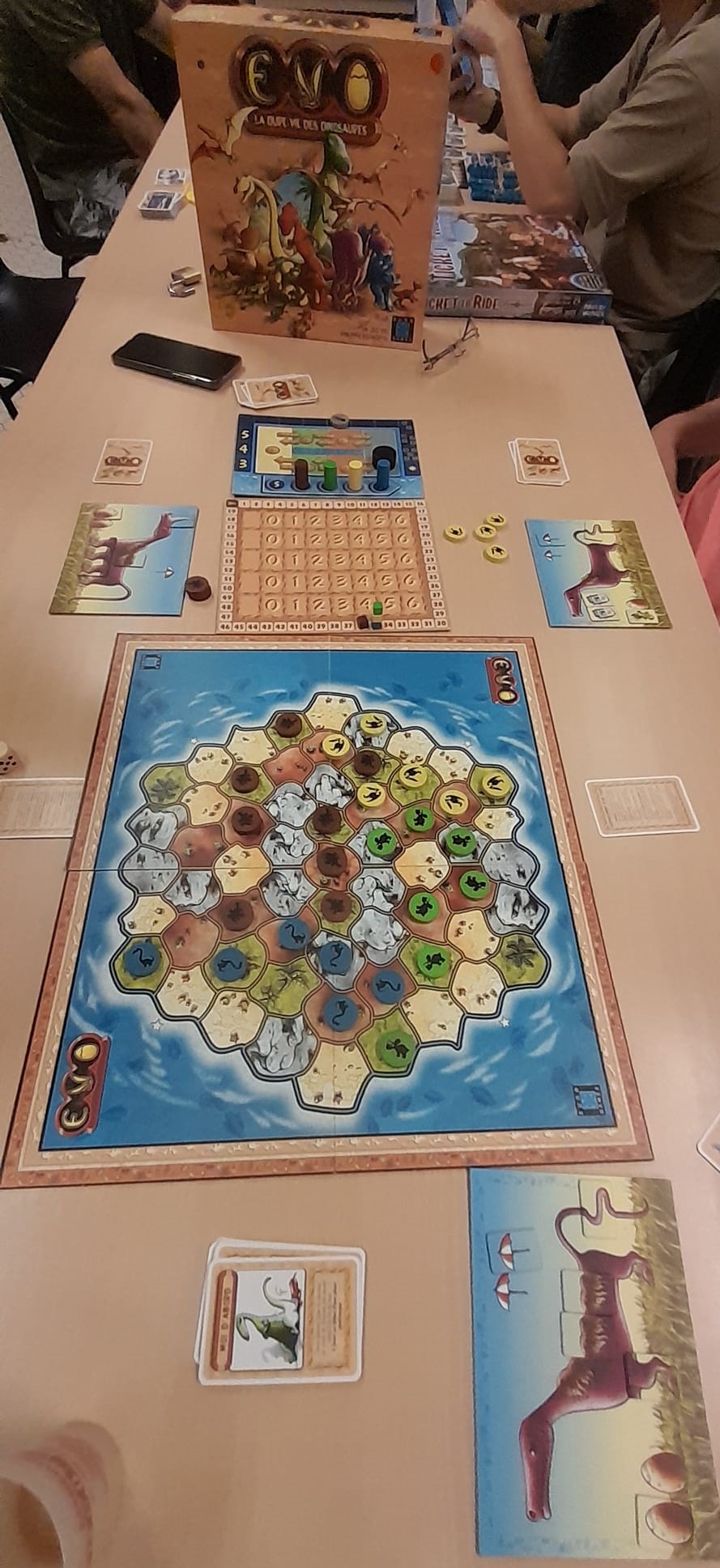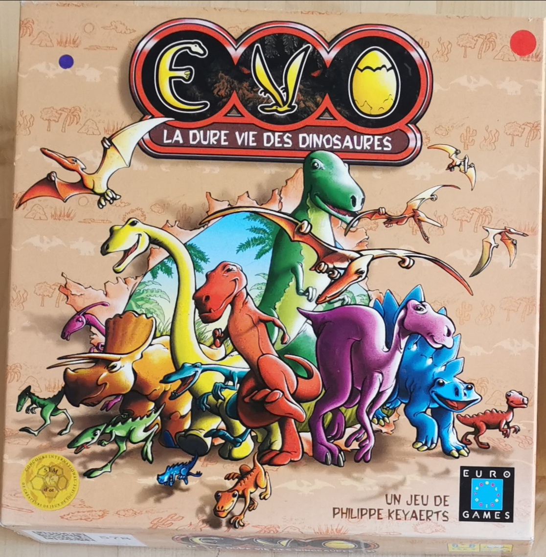Matériel : 1 règle du jeu, 1 plateau en 2 parties, 1 plateau "score", 1 plateau "information", 5 plateaux "dinosaures", 5 pions, 5 cubes, 1 dé, 1 marqueur noir, 1 pion gris "météorite", 50 pions "dinosaures", 26 cartes "évènements", 2 cartes "résumé", 1 sac en tissu, 62 fiches "gènes"