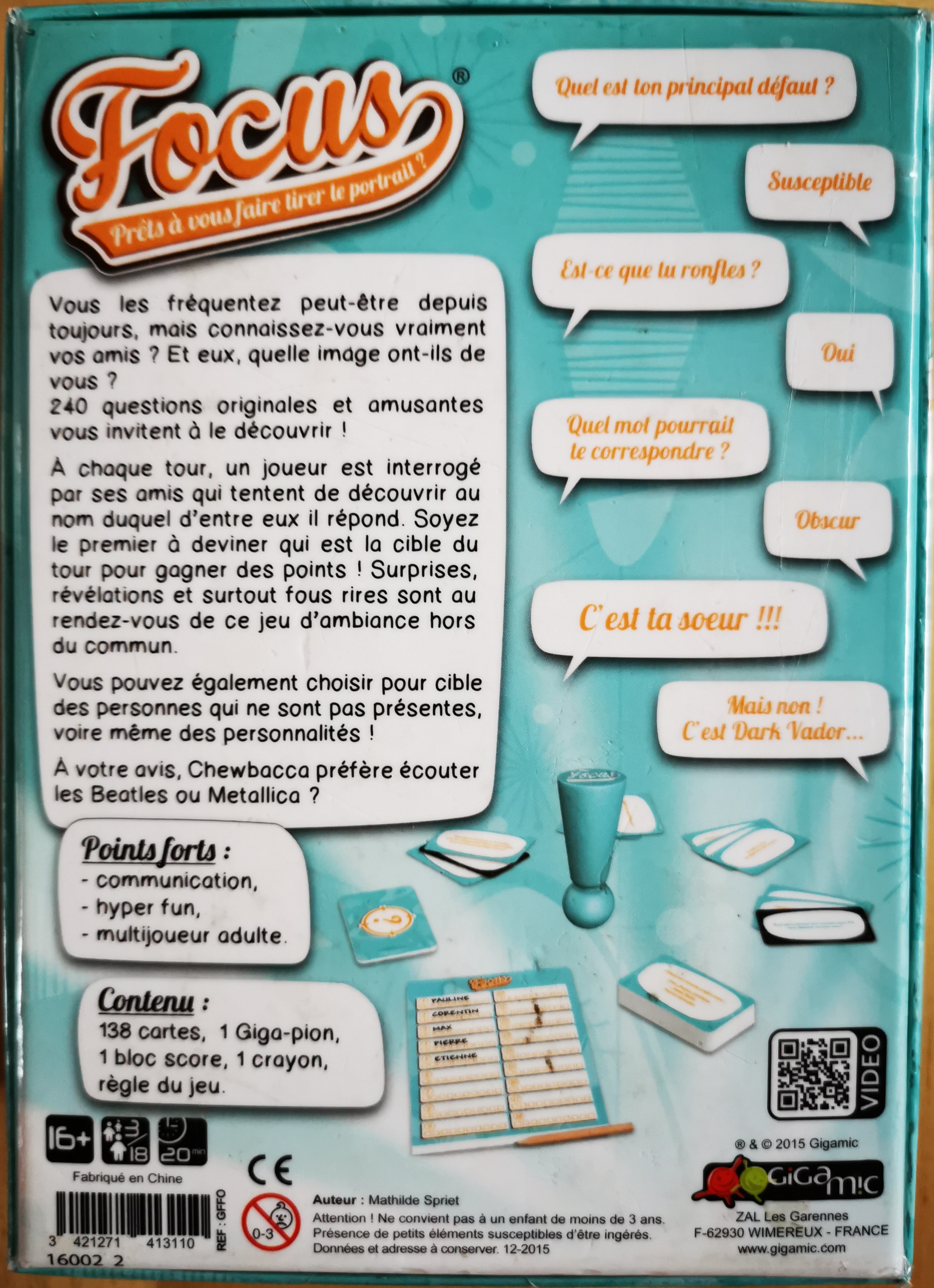 Matériel : 1 règle du jeu, 138 cartes, 1 pion géant, 1 bloc score, 1 crayon.