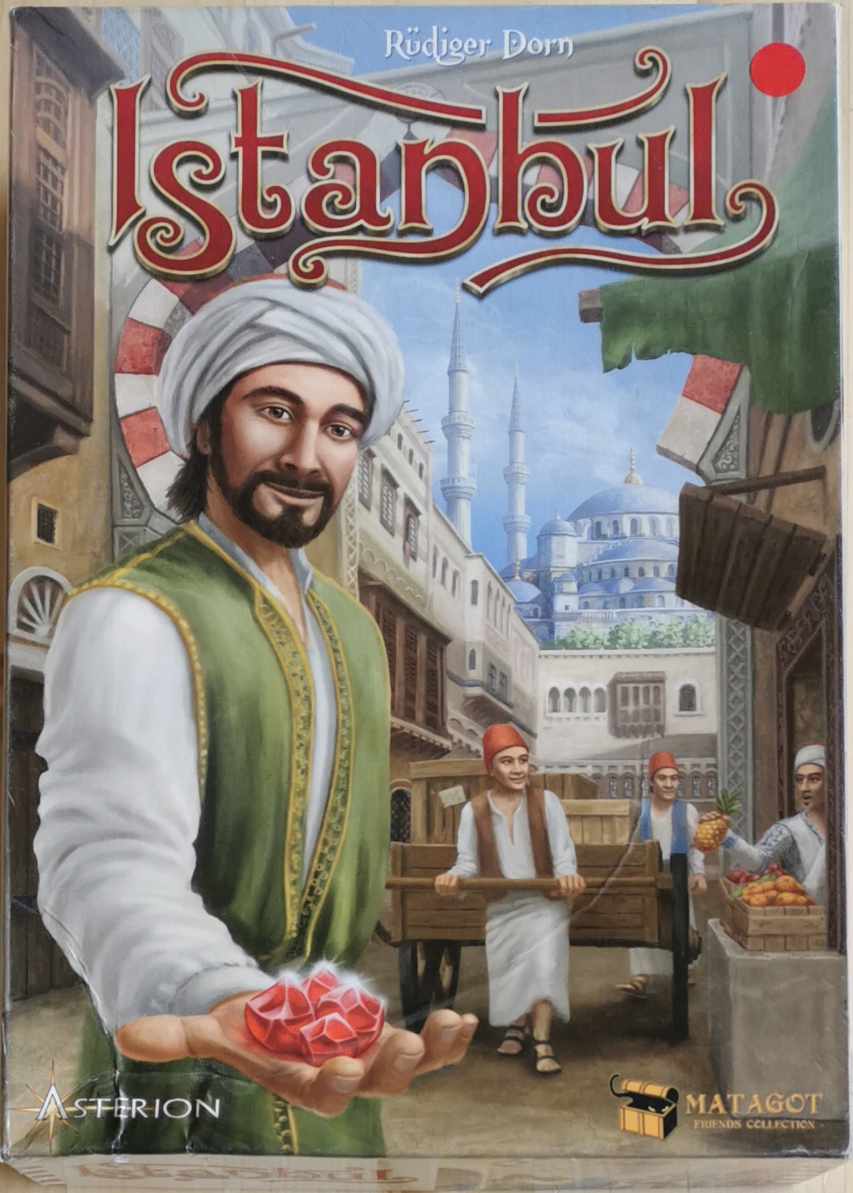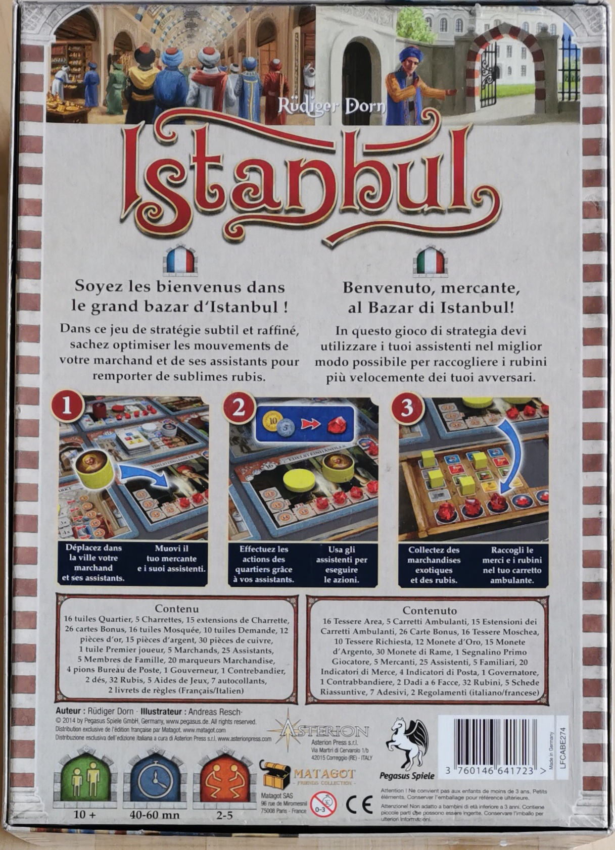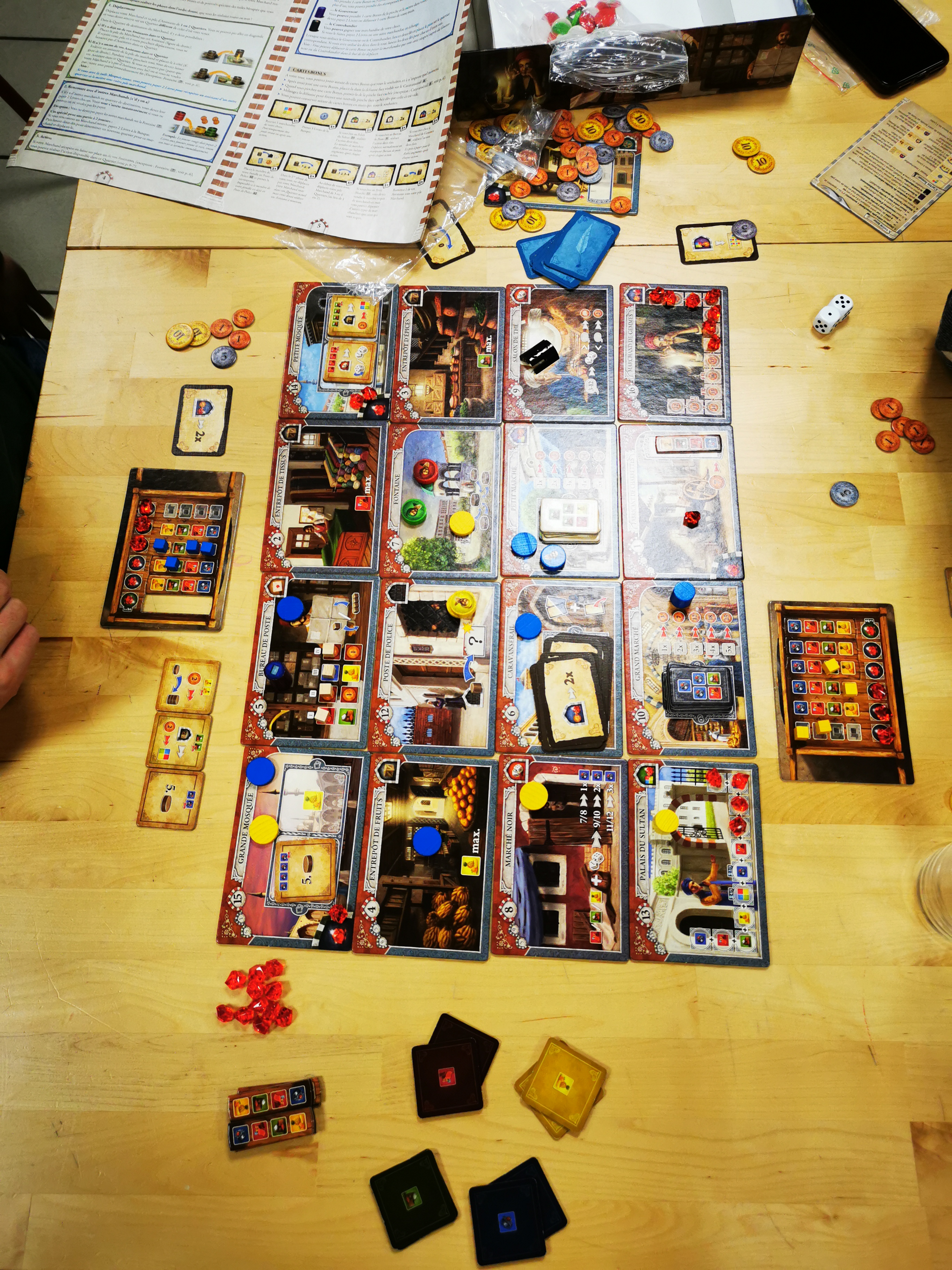 Matériel : 1 règle du jeu, 16 tuiles quartiers, 5 plateaux individuels Charettes, 15 tuiles extensions de Charettes, 10 tuiles demande, 16 tuiles mosquée, 26 cartes bonus, 57 pièces, 32 Rubis, 4 marqueurs Bureau de poste, 2 dès, 1 pion Gouverneur, 1 pion Contrebandier, 1 tuile 1er joueur, 5 aides de jeu, 11 pions par joueurs :, 1 pion marchand, 1 pion membre de la famille, 5 pions assistant, 4 carrés de marchandises