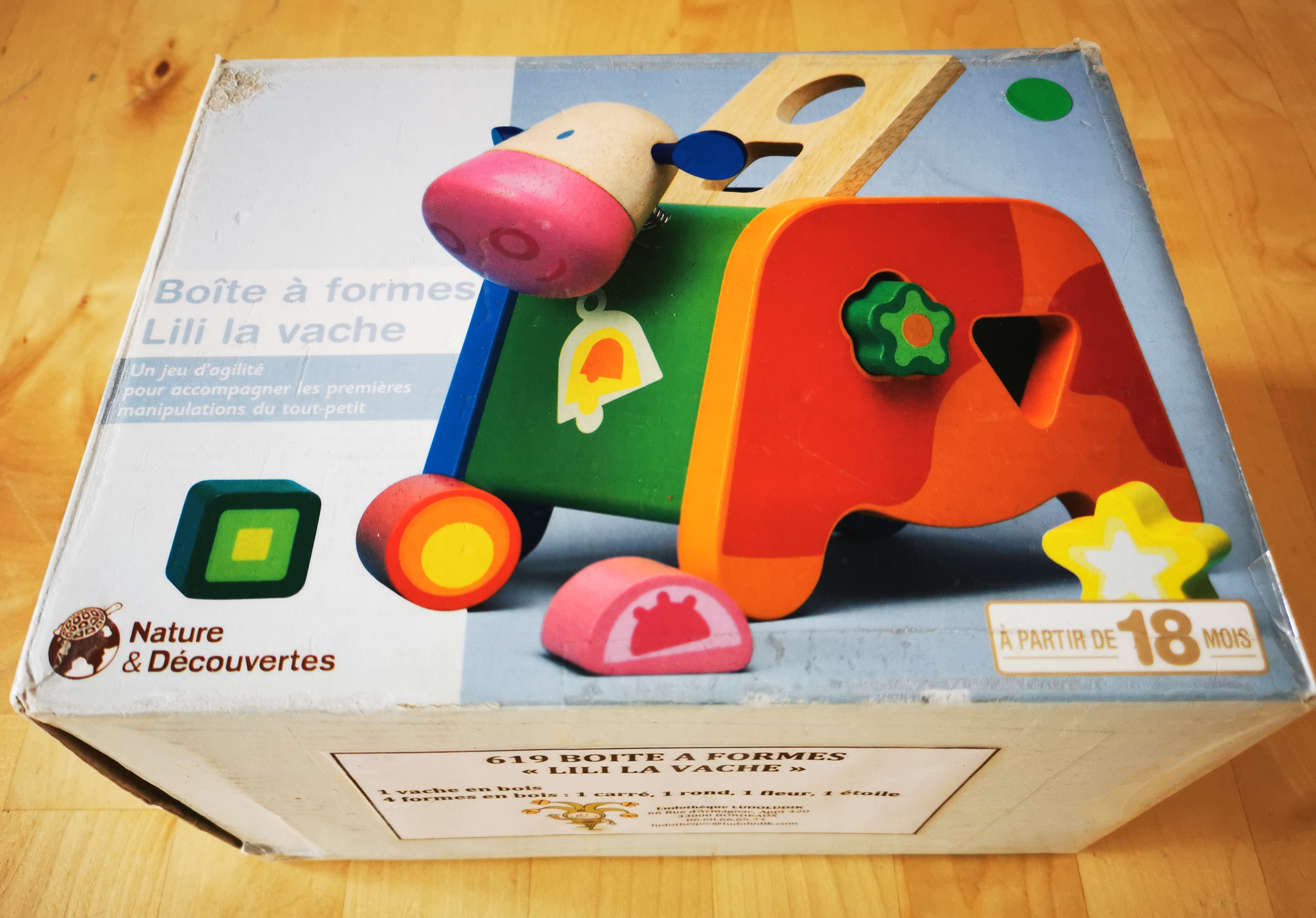 Matériel : 1 vache en bois, 4 formes en bois : 1 carré, 1 rond, 1 fleur, 1 étoile.