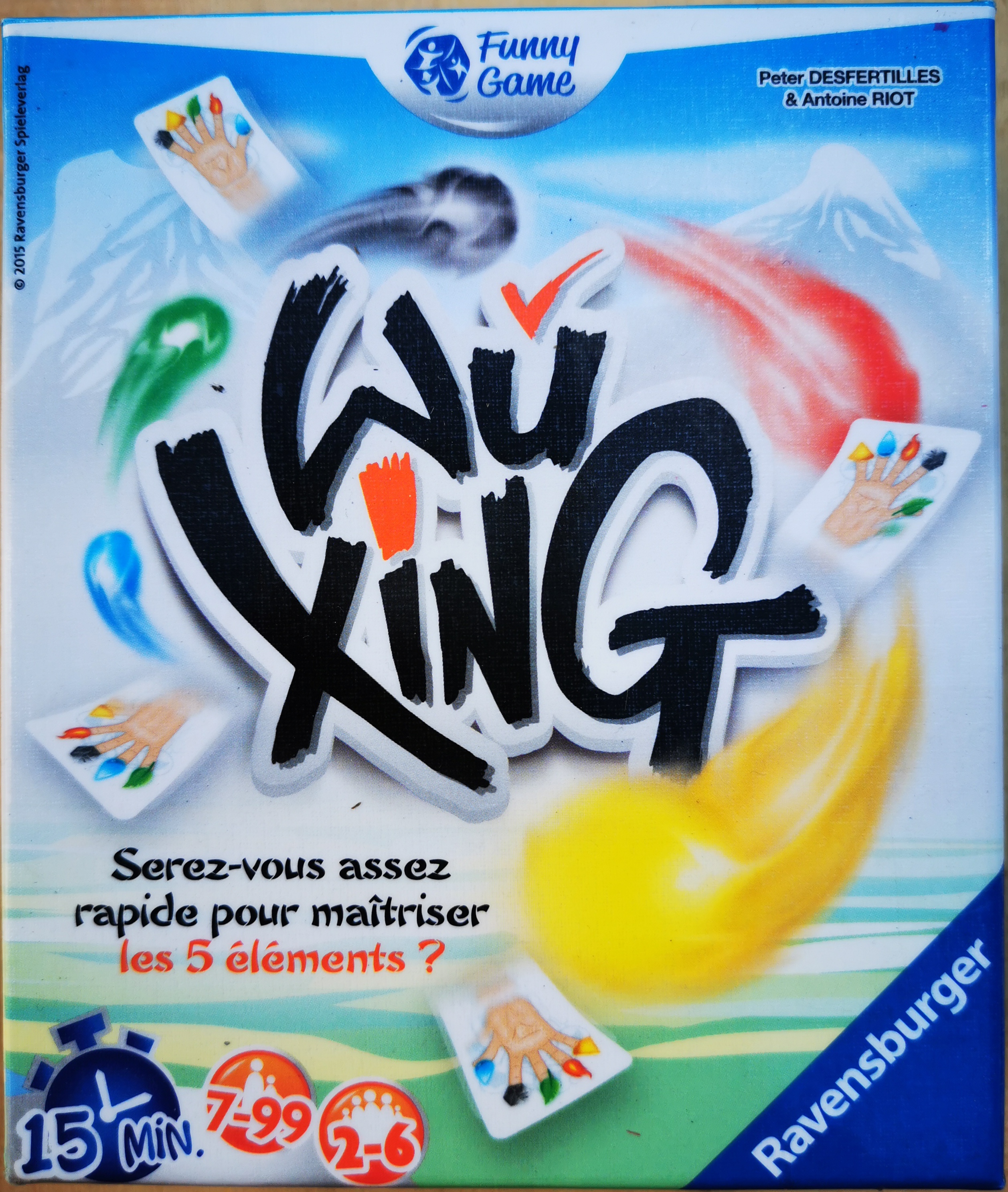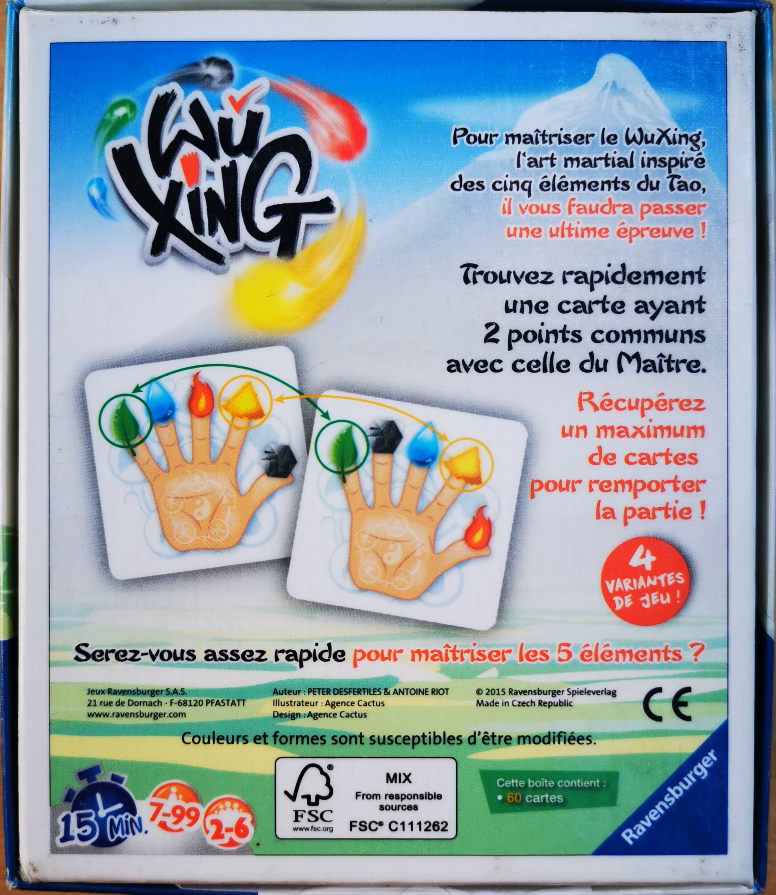 Description : Dans WuXing chacun dispose du même nombre de cartes et sur chacune une main (droite) est représentée avec au bout de chaque doigt l'un des 5 éléments (bois, feu, terre, métal, eau). Chaque carte présente des combinaisons doigt/éléments différentes, mais parfois il y a 1 ou 2 points communs avec d'autres cartes ! Le maître vous montre un exemple (une carte au centre de la table) : trouvez vite une carte avec 2 points communs.