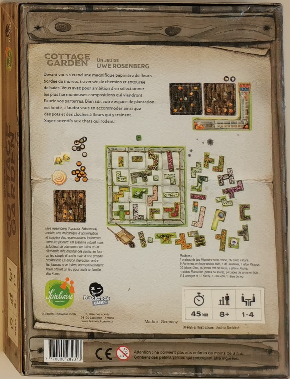 Matériel : 1 règle de jeu, 1 plateau Pépinière recto-verso , 36 tuiles Fleurs (pièces de puzzle), 9 plateaux Parterres recto-verso (un côté clair et un côté sombre) , 1 dé Jardinier , 1 jeton Parasol, 30 jetons Chat , 16 jetons Pot de fleurs, 2 jetons Ruche, 4 pistes de score Plantation en L , 12 cubes de score oranges , 12 cubes de score bleus, 1 Brouette