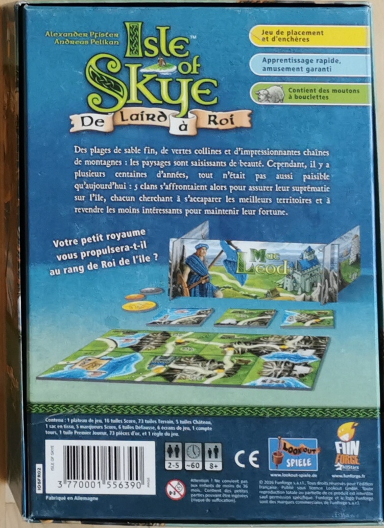Description : L'île de Skye est une île magnifique avec ses plages de sables, ses douces collines et ses montagnes impressionnantes : un paysage à couper le souffle. Dans ce jeu de tuiles, les joueurs sont des chefs de clans et vont devoir construire leur royaume.