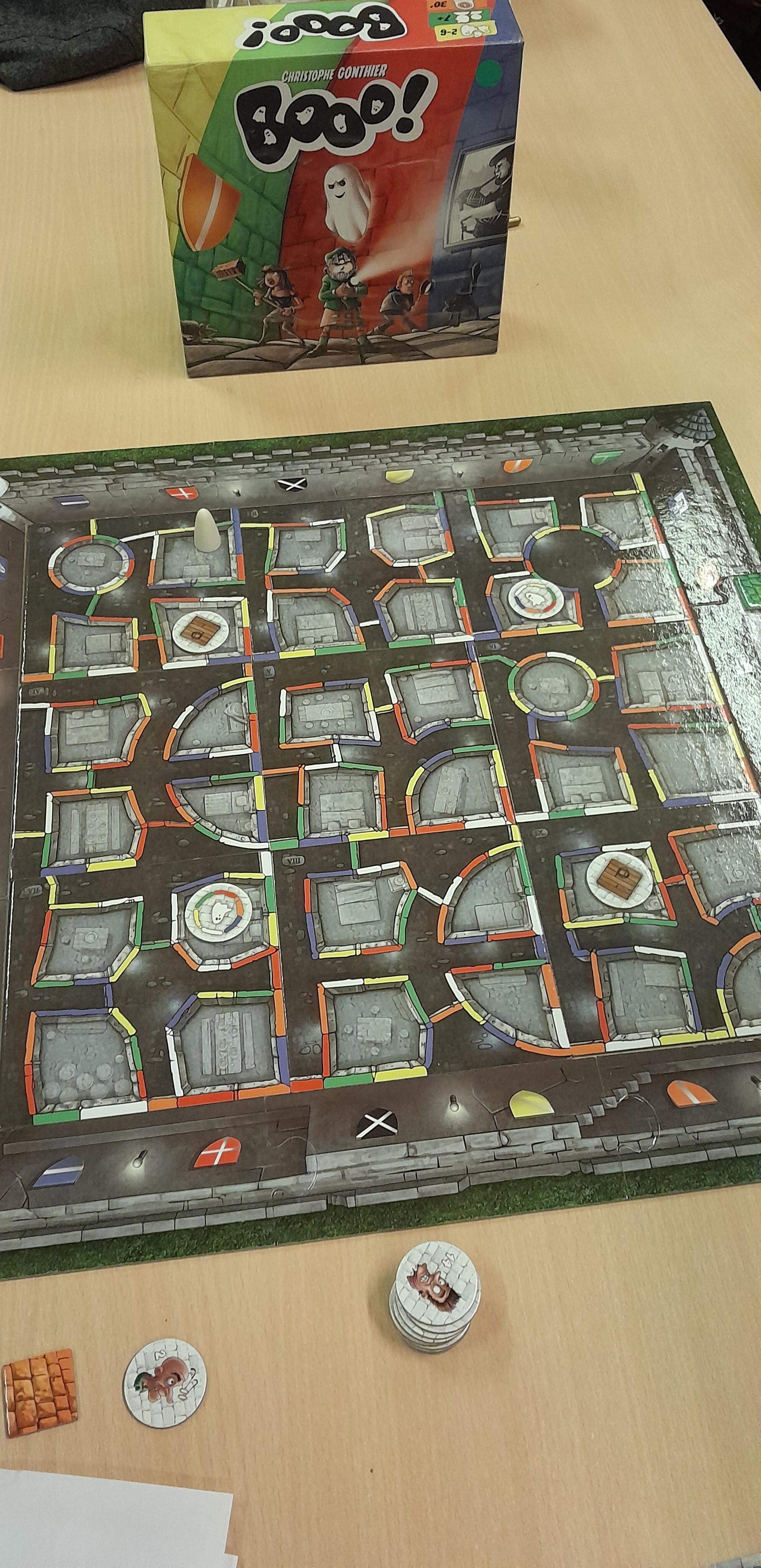Matériel : 8 tuiles « mur », 9 tuiles « château », 15 jetons « visiteur », 1 fantôme en bois, 6 tuiles couleurs, 4 jetons spéciaux, 1 règle de jeu.