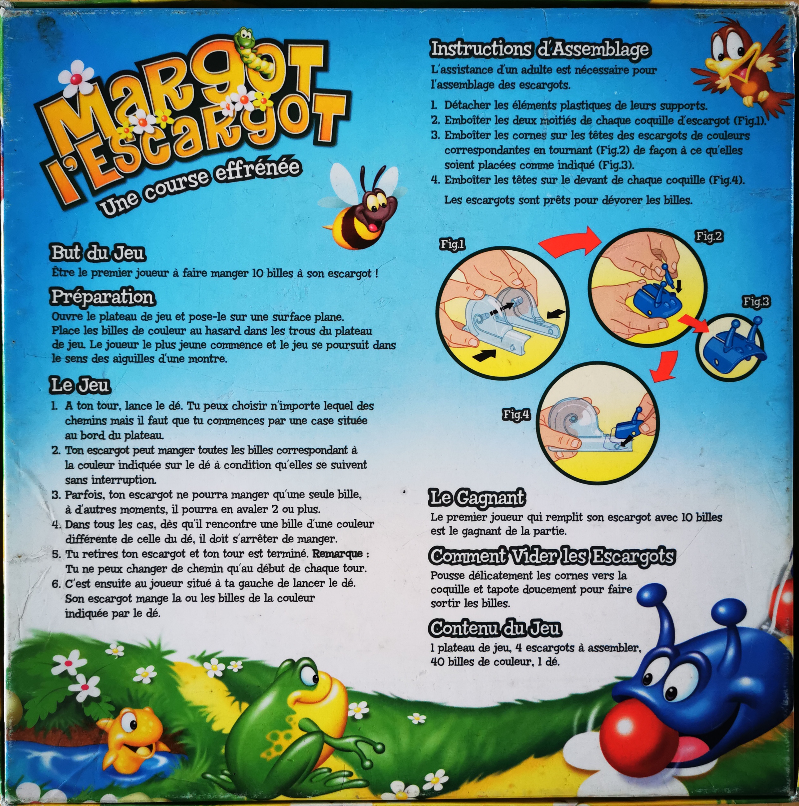 Description : Des petits escargots doivent manger des petites billes (3 couleurs) posées sur les différents chemins qui mènent à l'étang. À chacun son escargot, il faut être le premier à lui faire manger dix billes.