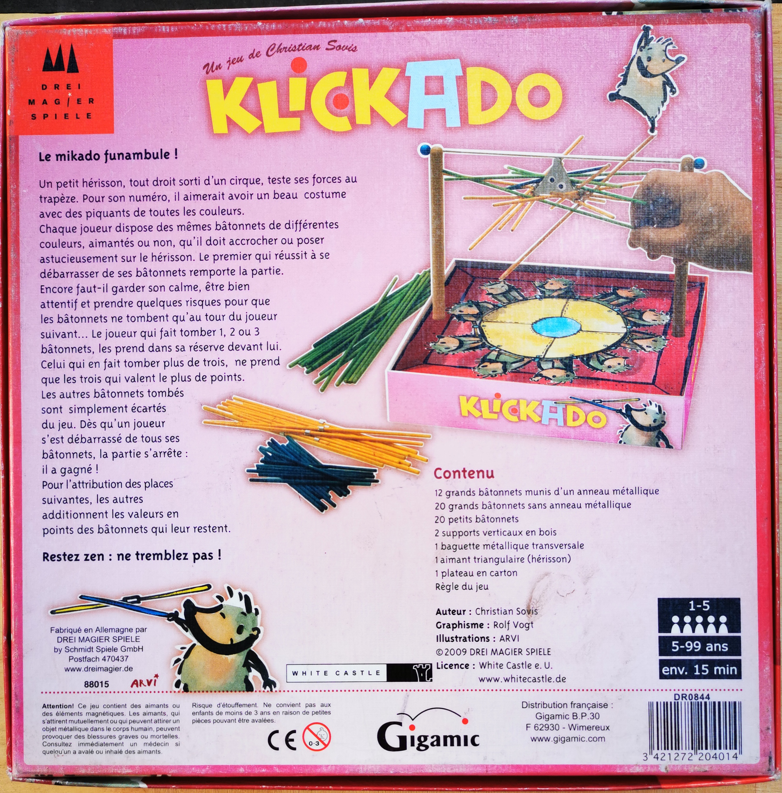 Matériel : 12 grands bâtonnets munis d’un anneau métallique , 20 grands bâtonnets sans anneau métallique , 20 petits bâtonnets , 2 supports , 1 baguette métallique , 1 hérisson , 1 cache en carton , règle du jeu.