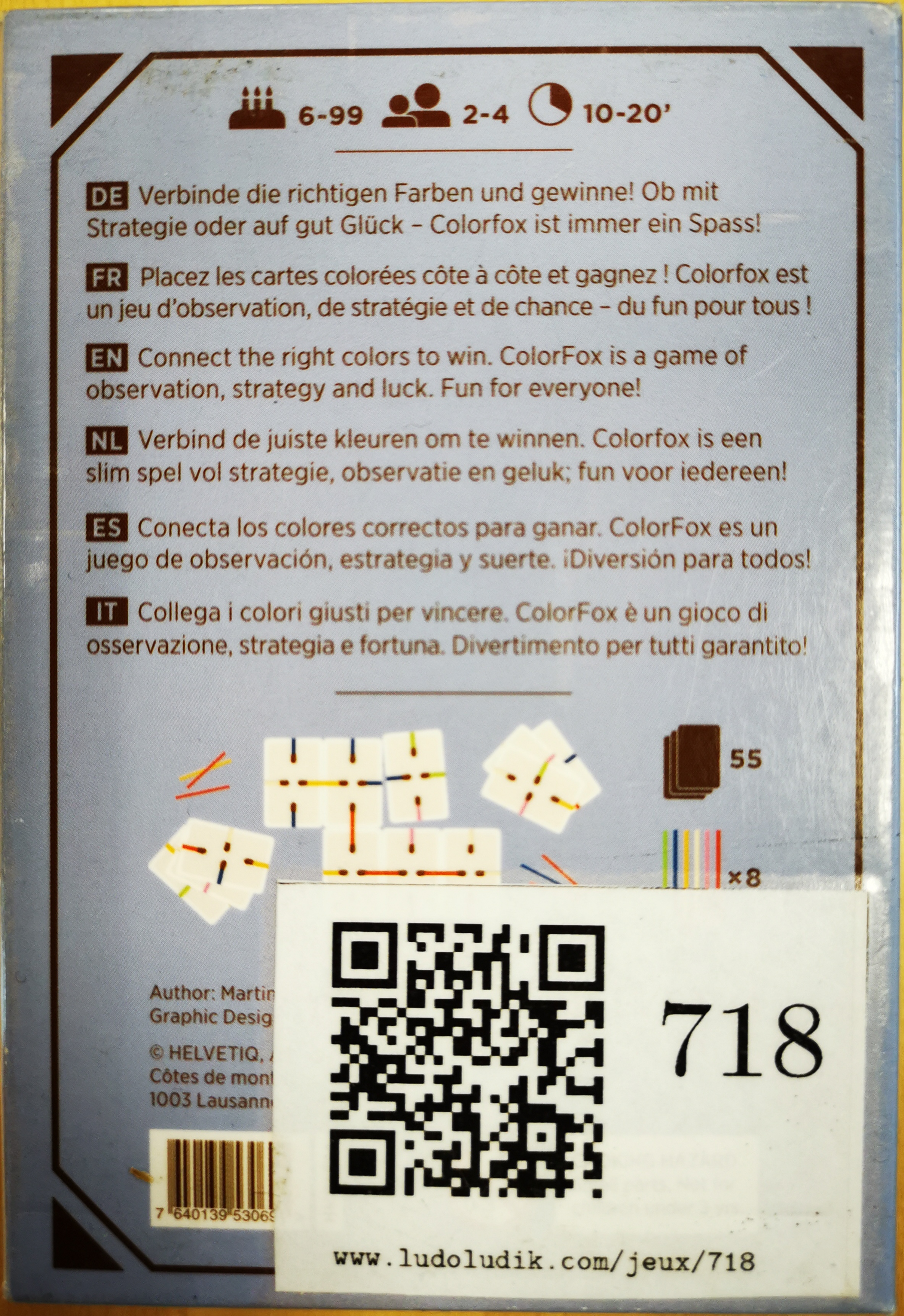 Matériel : 54 cartes, 48 bâtonnets colorés, les règles de jeu.