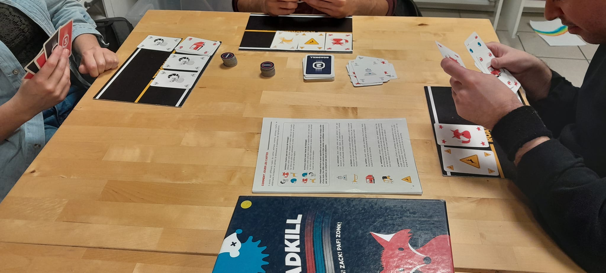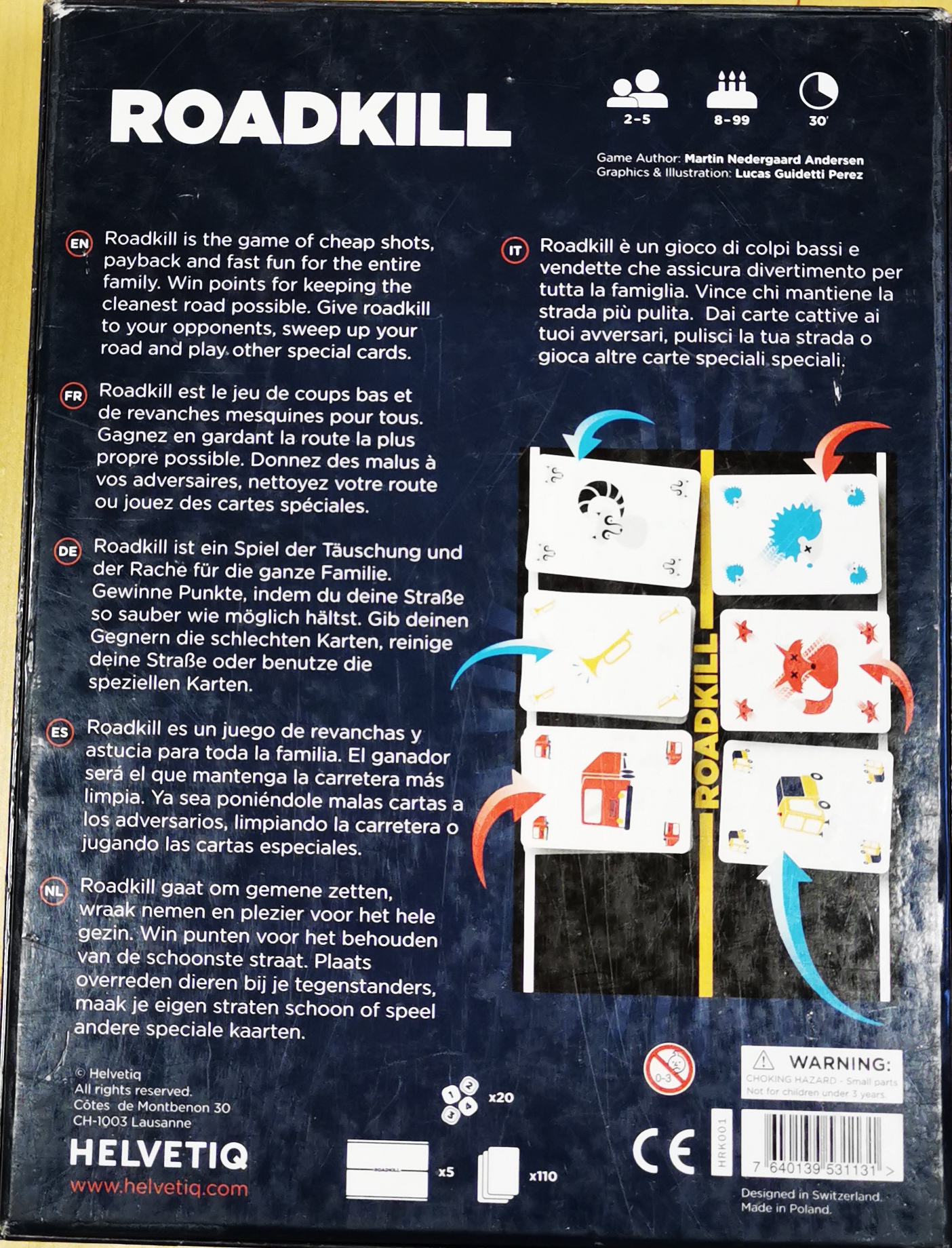 Description : Dans Roadkill nous allons jouer avec des animaux morts sur la route, autant le dire d’emblée, ainsi l’effet de surprise passé nous aurons tout le loisir de nous concentrer sur le jeu. Une fois le bon nombre de cartes pris selon le nombre de joueurs, chacun reçoit un plateau représentant une route, sur laquelle vous pourrez disposer jusqu’à 8 cartes. Puis tout le monde reçoit une main de 6 cartes. Sur ces cartes nous retrouvons des animaux, bien en vie ou mort, un vétérinaire pour soigner, un klaxon pour faire fuir un animal, le camion pour recouvrir la route, la nettoyeuse pour retirer les cadavres et enfin le panneau pour couvrir un espace vide., , À votre tour de jeu, vous devrez poser une carte sur votre plateau ou celui de l’un de vos adversaires. Appliquant le pouvoir ou la règle de pose à chaque fois. Un même animal ne pouvant être posé sur la même portion de route par exemple. Le but étant d’avoir le moins de camions et d’animaux morts sur sa route et dans sa main à la fin de la manche, afin de pouvoir récolter des jetons de points. Le joueur ayant le plus de points à la fin des 3 manches remporte la partie.
