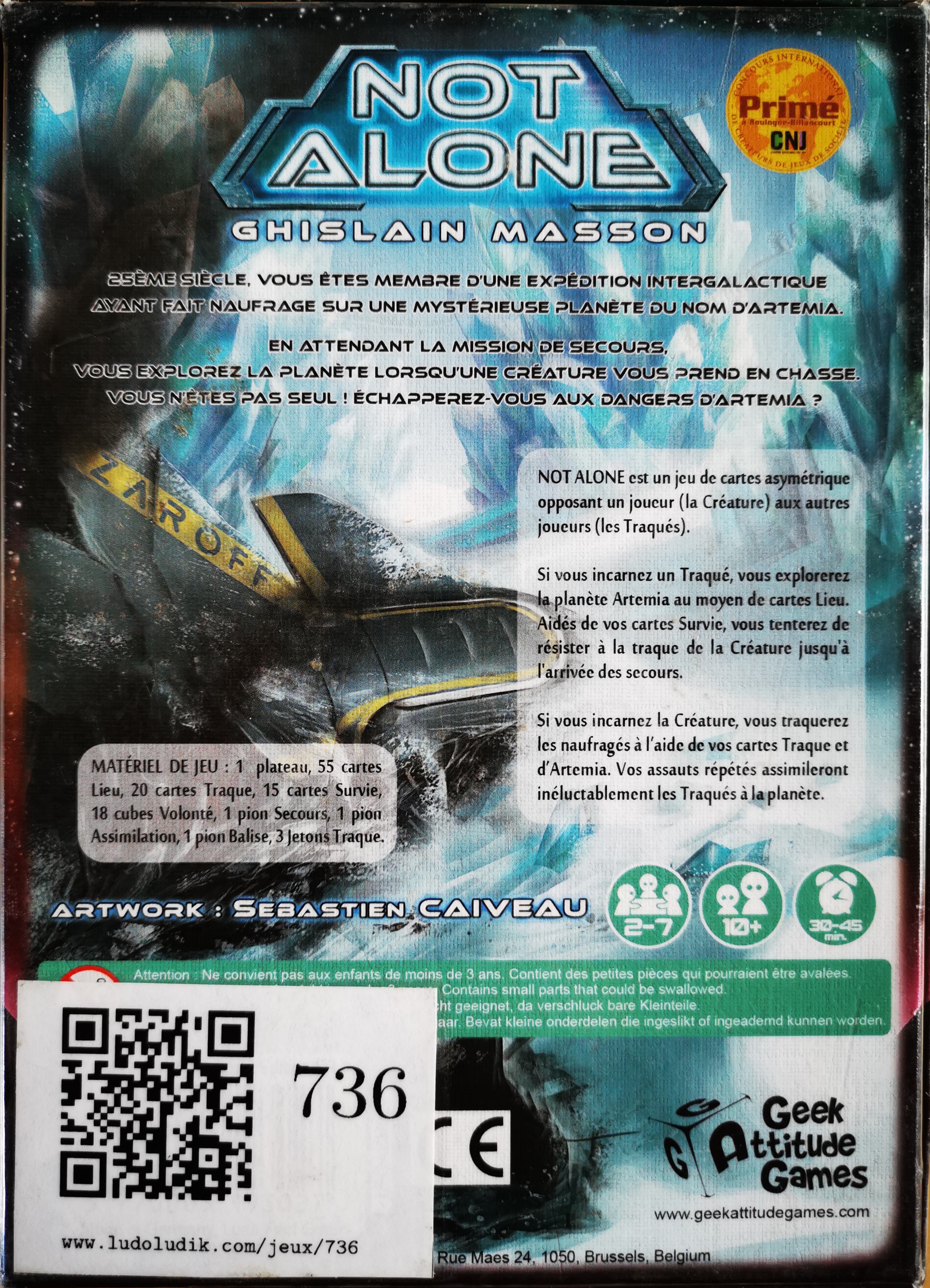 Matériel : 1 plateau, 55 cartes Lieu, 20 cartes Traque, 15 cartes Survie, 18 cubes Volonté, 1 pion Secours, 1 pion Assimilation, 1 pion Balise, 3 Jetons Traque.