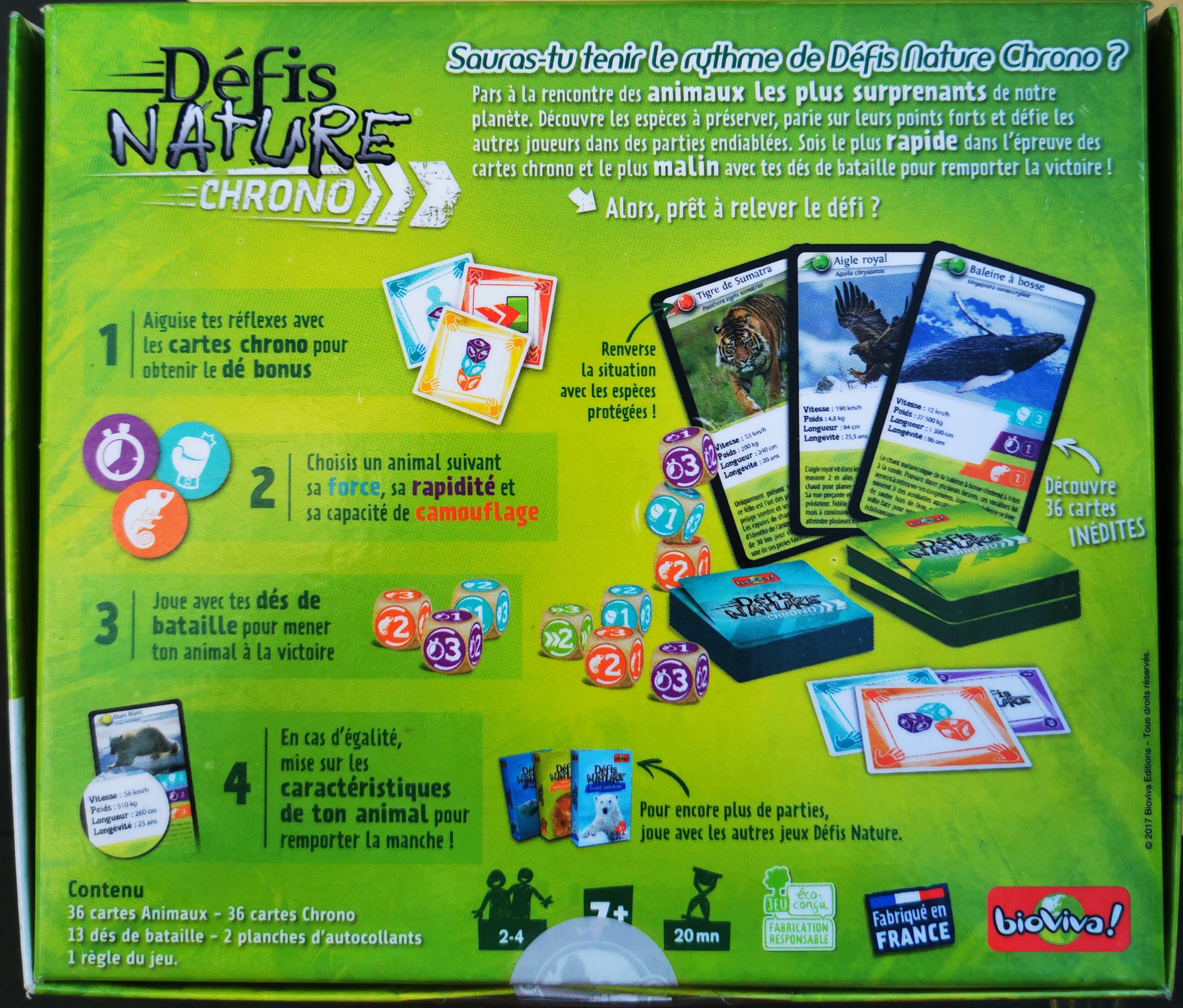 Matériel : 36 cartes animaux, 36 cartes chrono, 13 dés de bataille, 2 planches d'autocollants, 1 règle du jeu