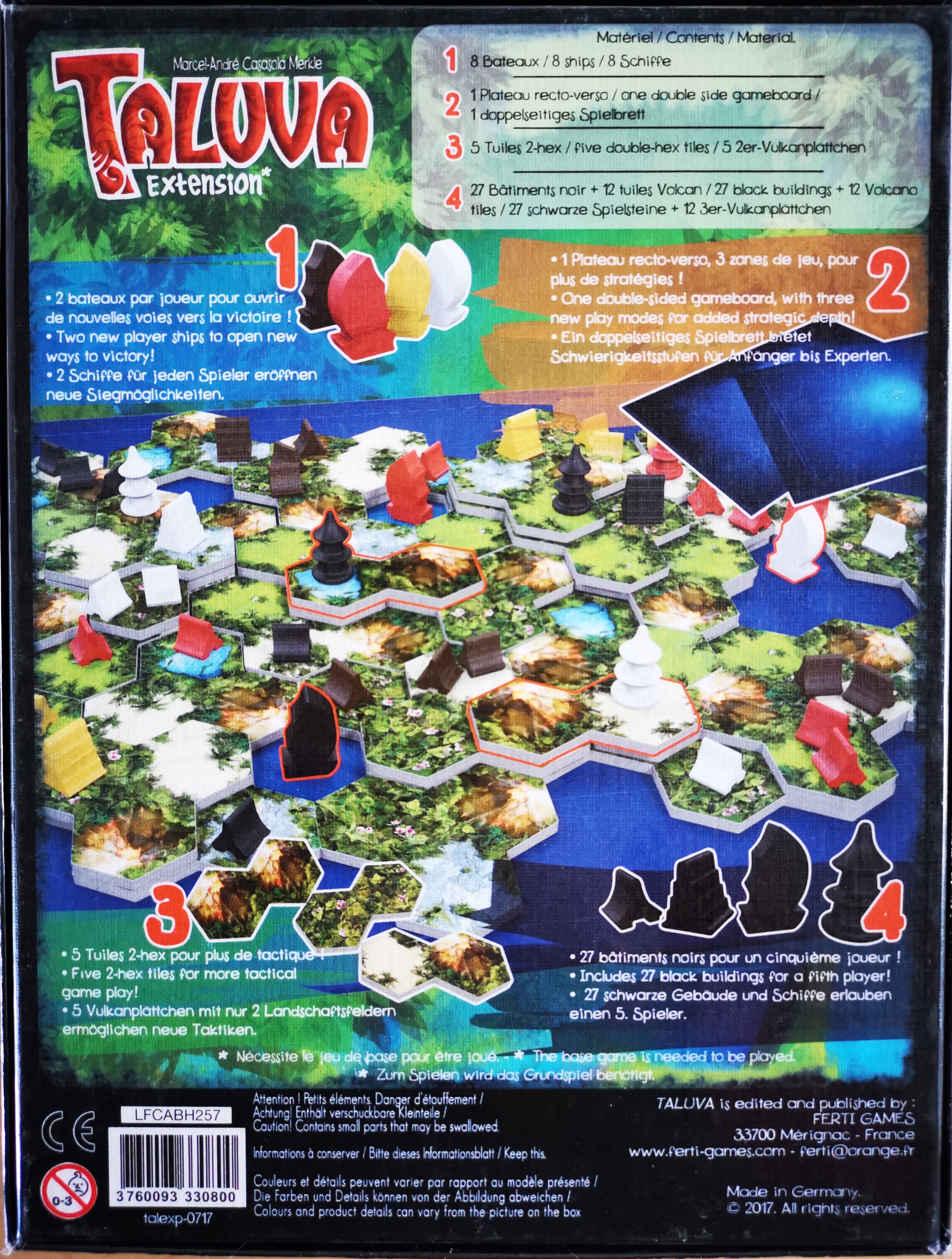 Matériel : 8 Bateaux, 1 Plateau Recto Verso, 5 Tuiles 2-Hex, 27 Bâtiments Noirs, 12 Tuiles Volcan.