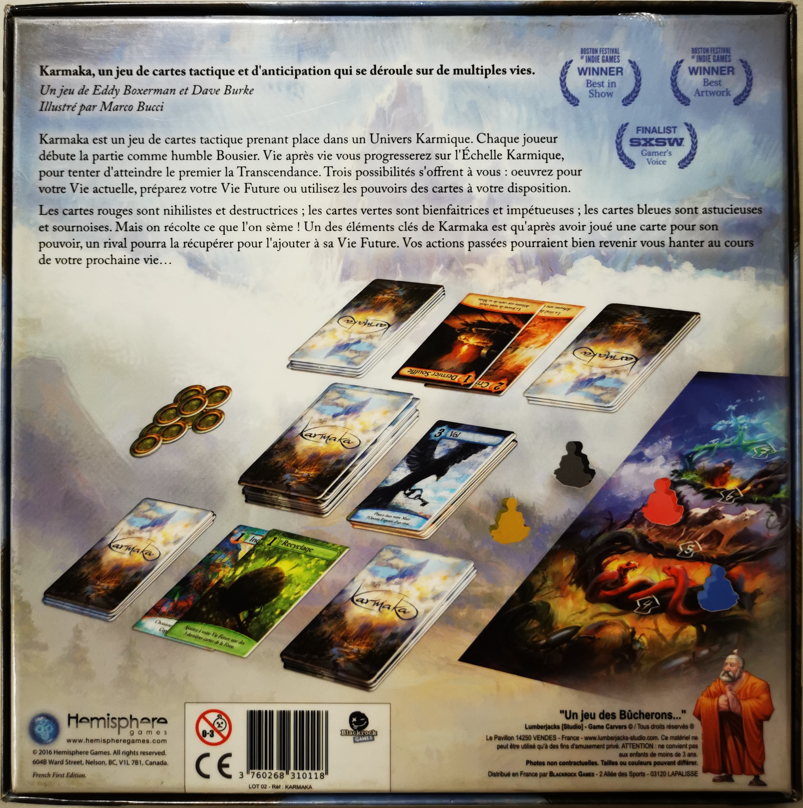 Matériel : 70 cartes, 1 plateau de jeu, 4 meeples "Bouddha" , 12 jetons Karmiques , 1 sac en tissu , 1 livret de règle.