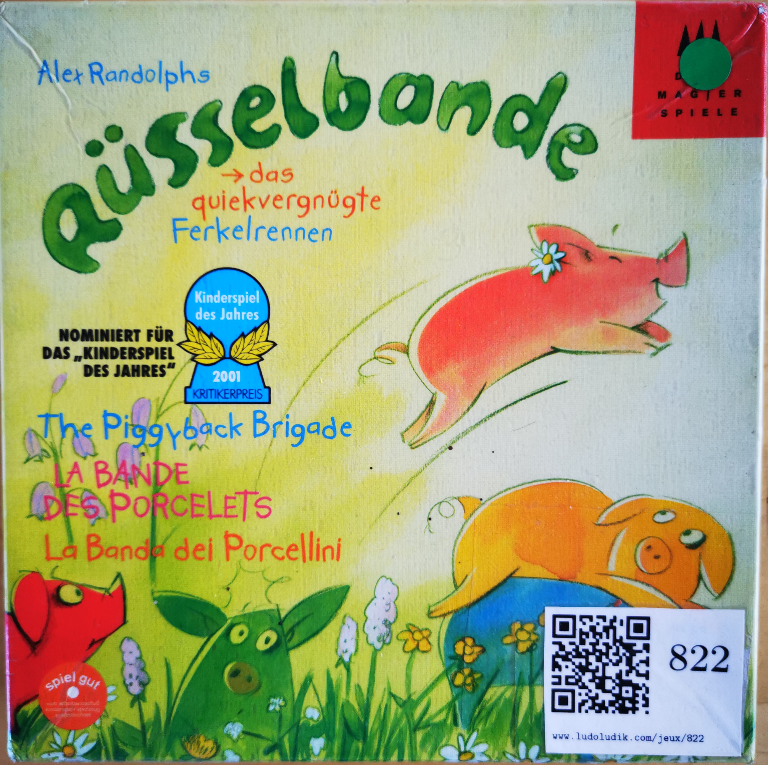 Matériel : Plateau de jeu (8 planchettes aux recto-verso variés), 7 porcelets en bois colorés, 7 jetons en bois correspondants, 1 dé spécial (6 faces : 1,1,2,3,3,4), 1 règle du jeu.