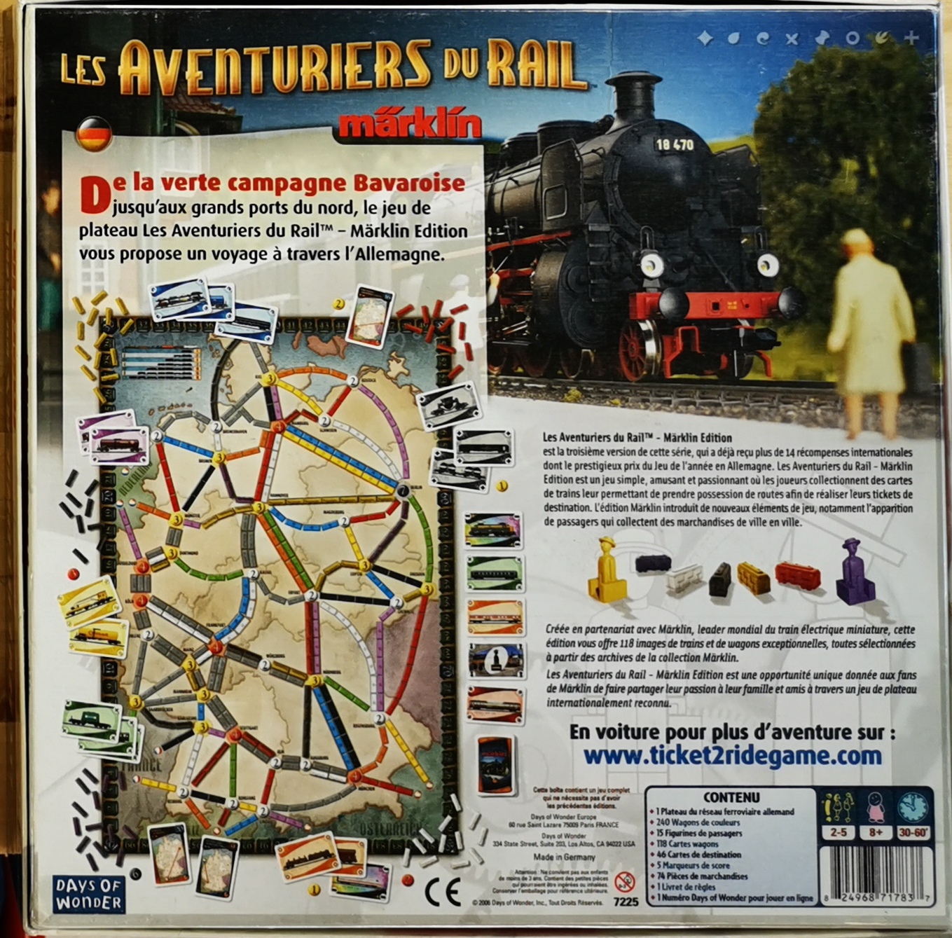 Description : Ce jeu n'est pas une extension des "Aventuriers du rail" mais un jeu à part entière qui représente le réseau ferré allemand. Au niveau matériel, chaque carte wagon (118 en tout) aura une illustration différente représentant certains modèles de trains électriques Märklin.