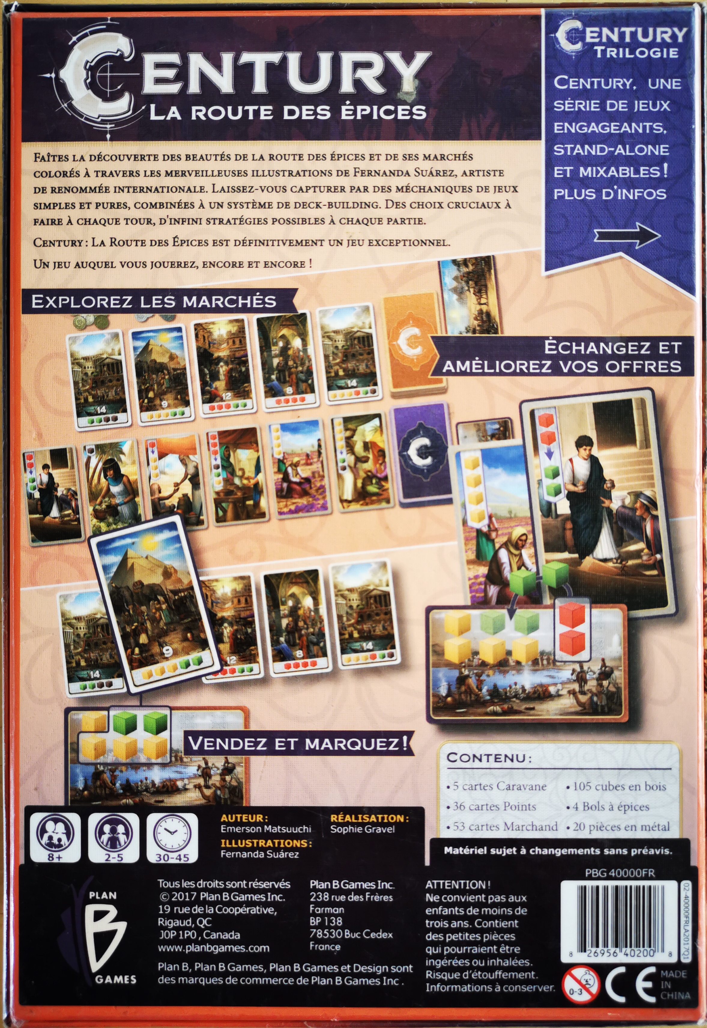 Description : Faîtes la découverte des beautés de la route des épices et de ses marchés colorés à travers les merveilleuses illustrations de Fernanda Suárez, artiste de renommée internationale. Laissez-vous capturer par des mécaniques de jeux simples et pures, combinées à un système de deck-building. Des choix cruciaux à faire à chaque tour, d'infinies stratégies possibles à chaque partie.