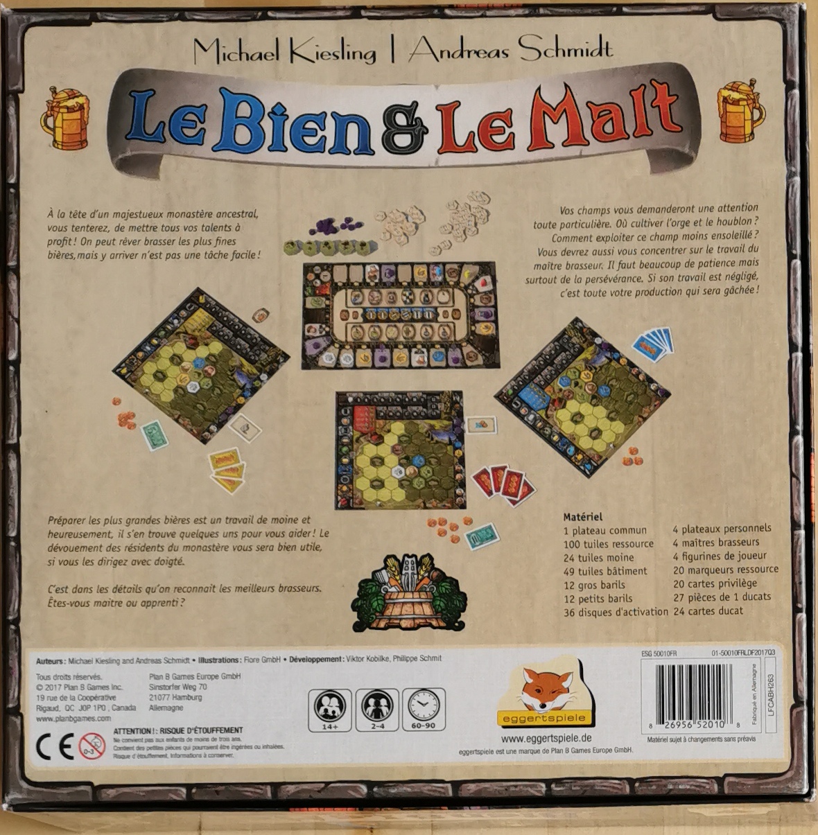 Description : Vous êtes chargé de diriger un ancien monastère et sa brasserie. Maintenant, c'est à vous de brasser la meilleure bière sous le ciel bleu de Dieu ! L'art de brasser de la bière exige votre meilleur timing. Afin d'obtenir les meilleurs résultats de votre production, vous devez fournir au jardin de votre cloître des ressources fertiles et le bon nombre de moines aidant à la récolte - mais gardez à l'esprit votre maître brasseur, car il est prêt et désireux d'affiner chacun de vos fûts ! Dans Le Bien & Le Malt, vous devez surmonter la rude concurrence des autres joueurs. Il y a un juste équilibre entre l'amélioration du jardin de votre cloître et la récolte des ressources dont vous avez besoin pour remplir vos barriques. Seuls ceux qui parviennent à garder la tête froide peuvent gagner la course à la meilleure bière !