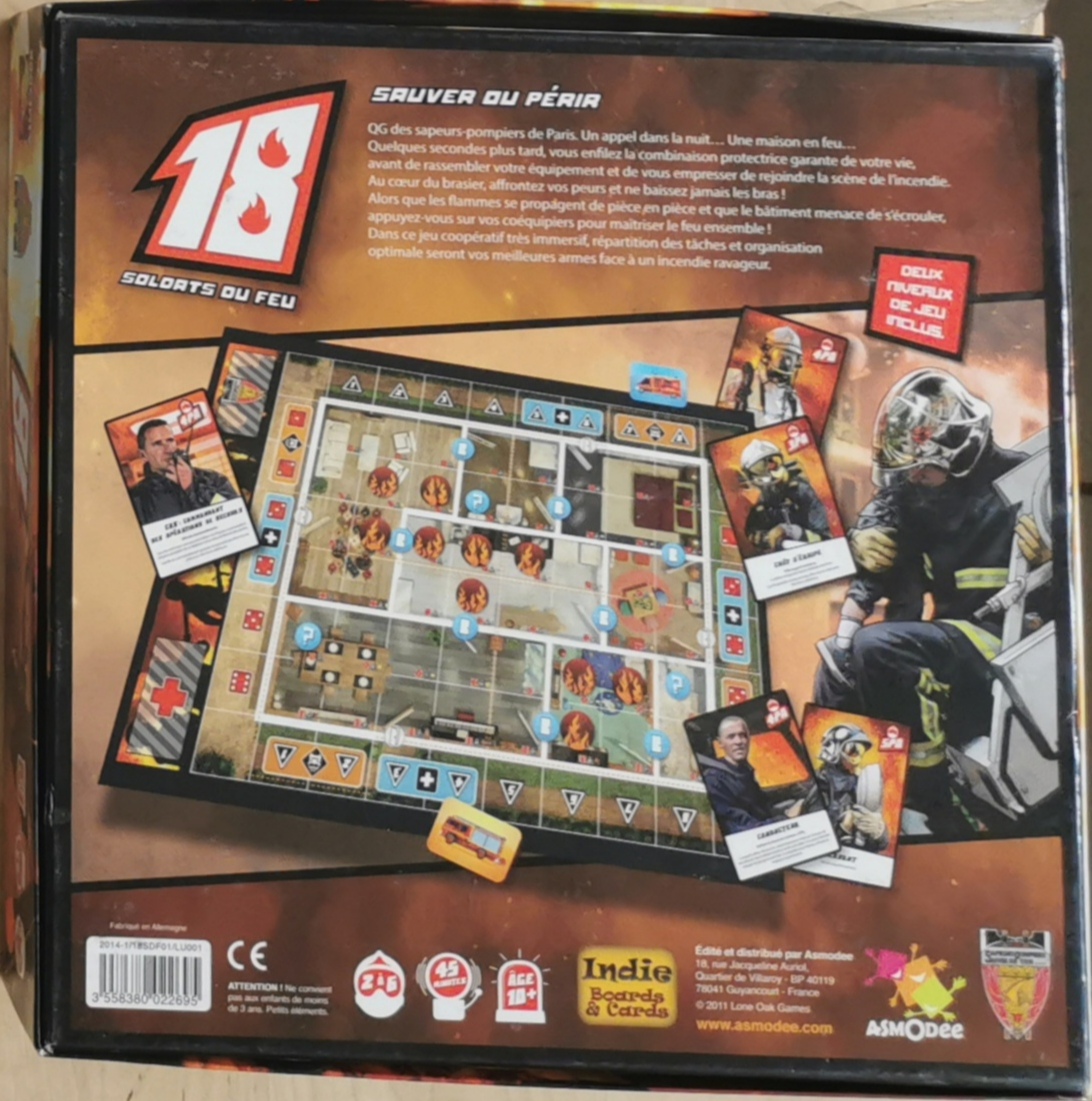 Matériel : 1 règle du jeu, 1 plateau, 6 pompiers, 36 Marqueurs menaces, 18 marqueurs HAS, 24 marqueurs dégâts, 8 marqueur porte, 24 marqueurs point chaud, 31 autre Marqueurs, 2 dés, 2 véhicules, 6 cartes insignes, 8 Spécialistes.