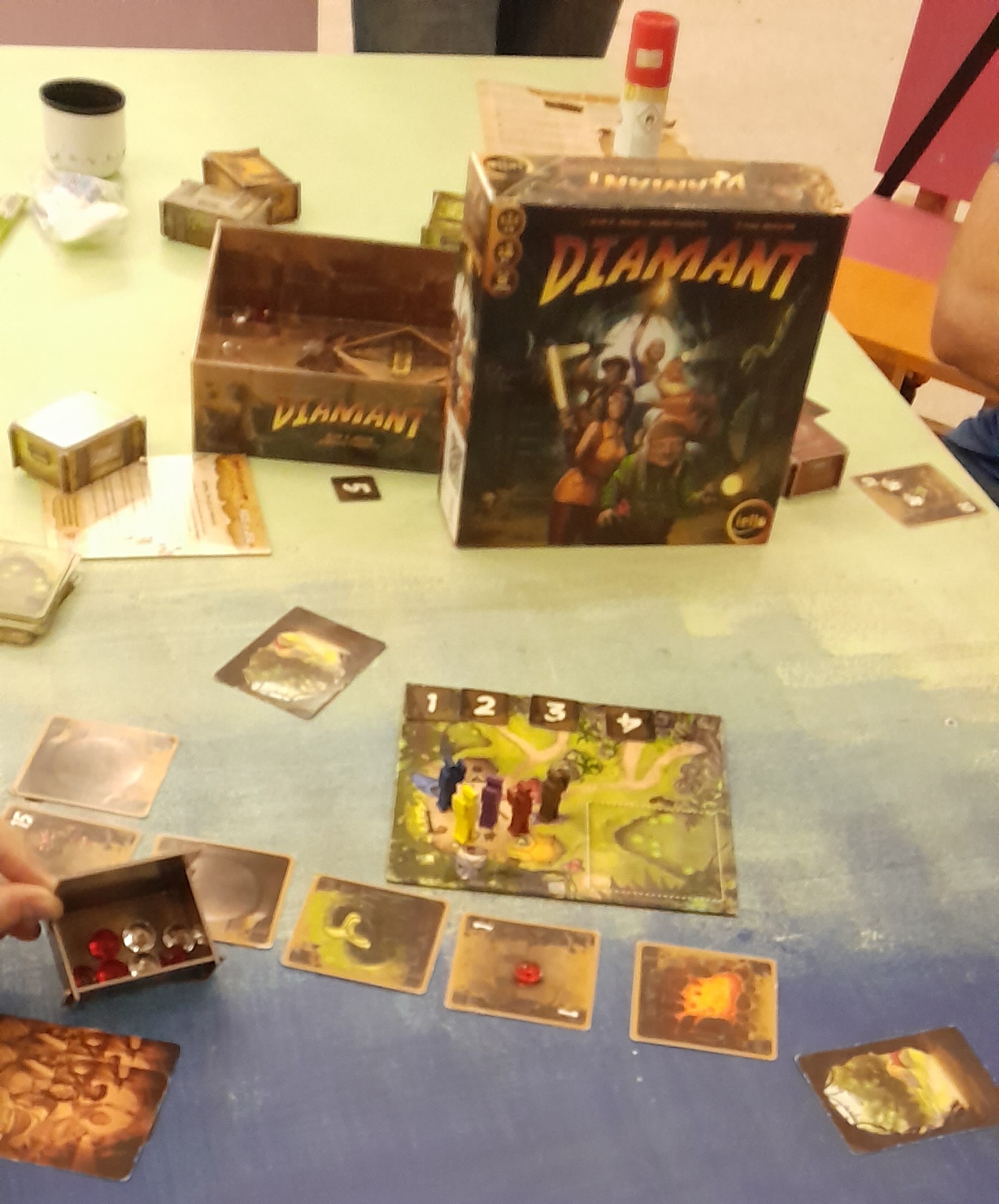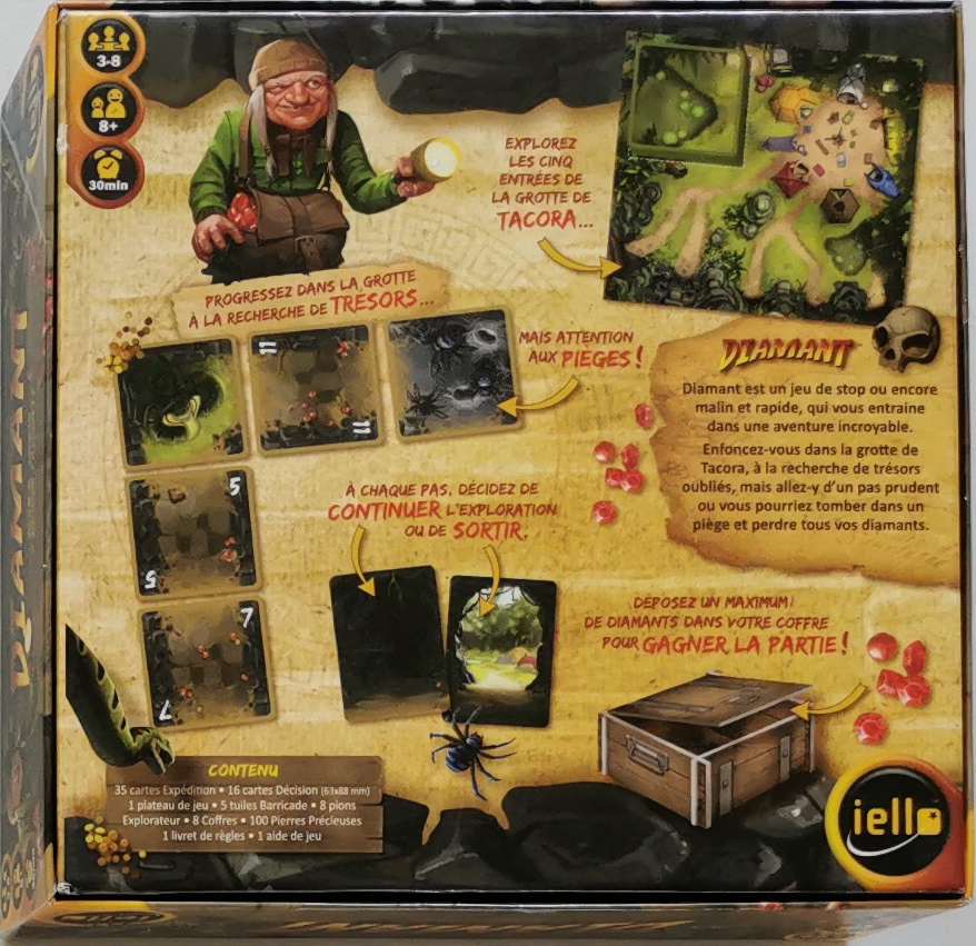 Matériel : 51 cartes, 1 plateau, 100 pierres précieuses, 8 pions, 8 coffres, 5 tuiles barricades, 1 règle du jeu