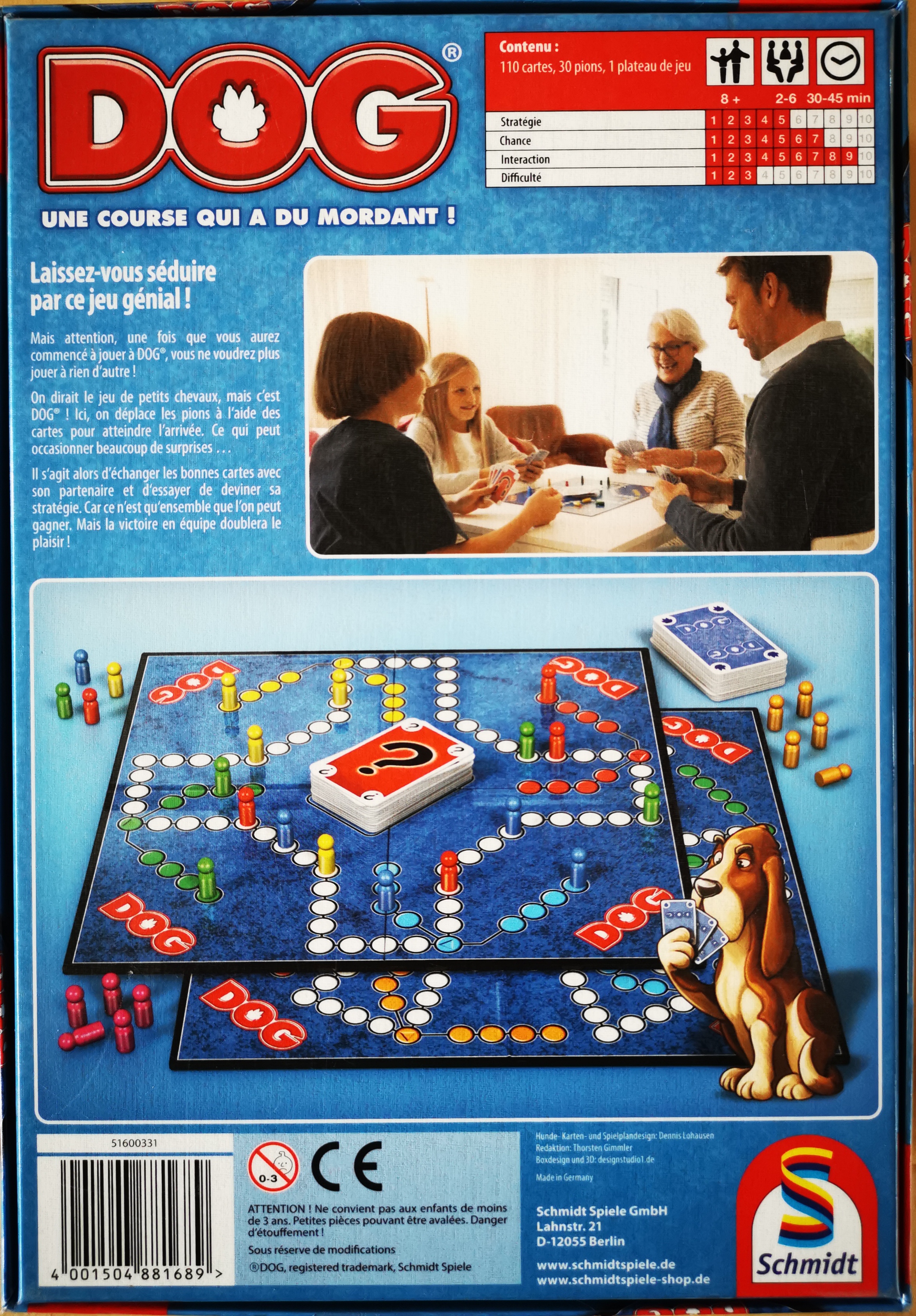 Description : Laissez vous séduire par ce jeu génial ! Mais attention, une fois que vous aurez commencé à jouer à Dog, vous ne voudrez plus jouer à rien d'autre ! On dirait le jeu de petits chevaux, mais c'est Dog ! Ici, on déplace les pions à l'aide des cartes pour atteindre l’arrivée. Ce qui peut occasionner beaucoup de surprises... Il s'agit alors d’échanger les bonnes cartes avec son partenaire et d'essayer de deviner sa stratégie. Car ce n'est qu'ensemble que l'on peut gagner. Mais la victoire en équipe doublera le plaisir !