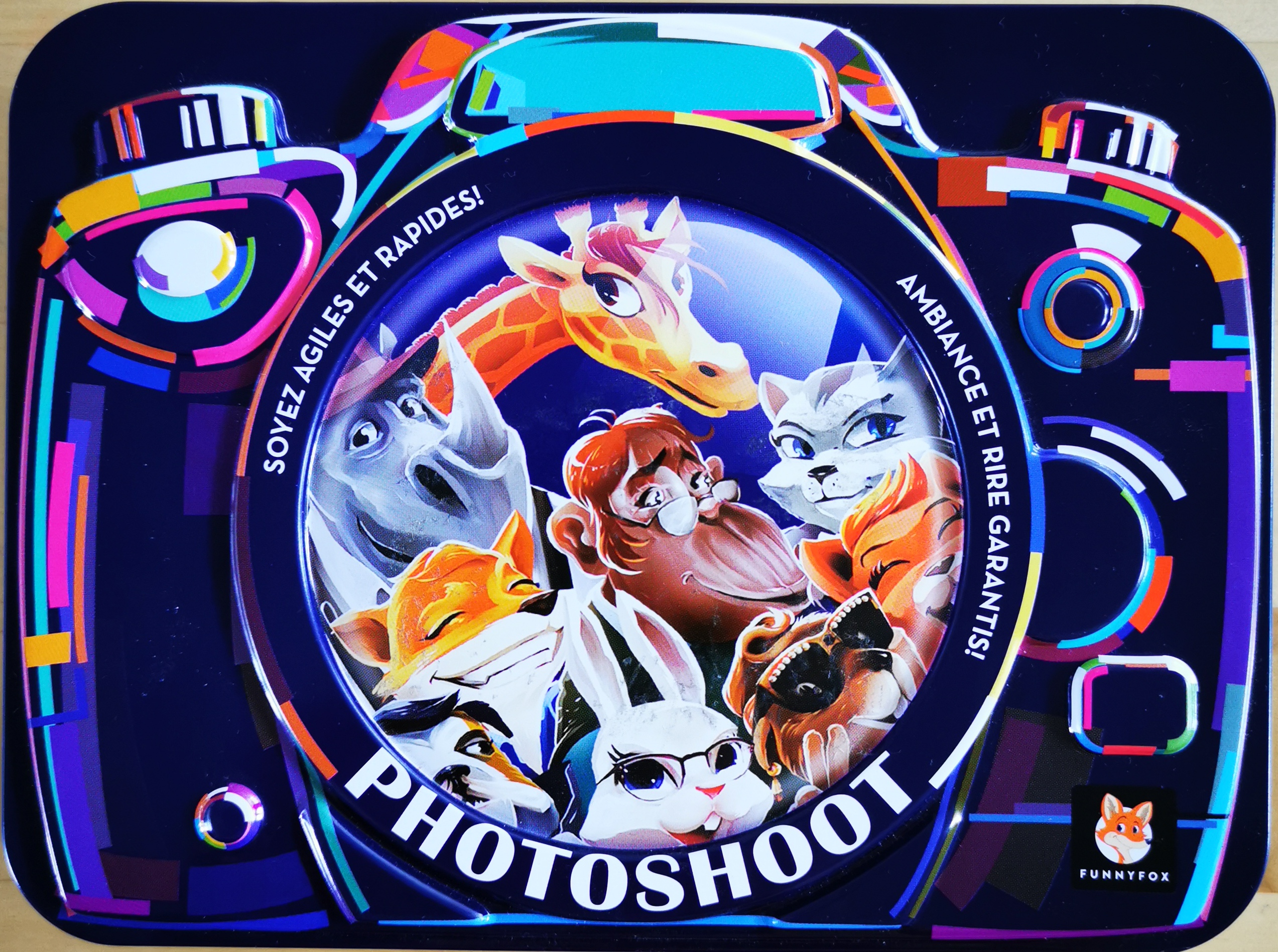 Matériel : 1 règle, 1 plateau de score, 9 tuiles personnages (recto-verso), 50 objectifs de photo, 2 pions en forme d'appareil-photo, 1 sablier, 10 jetons ronds appareil photo multicolore, 14 cartes effets.