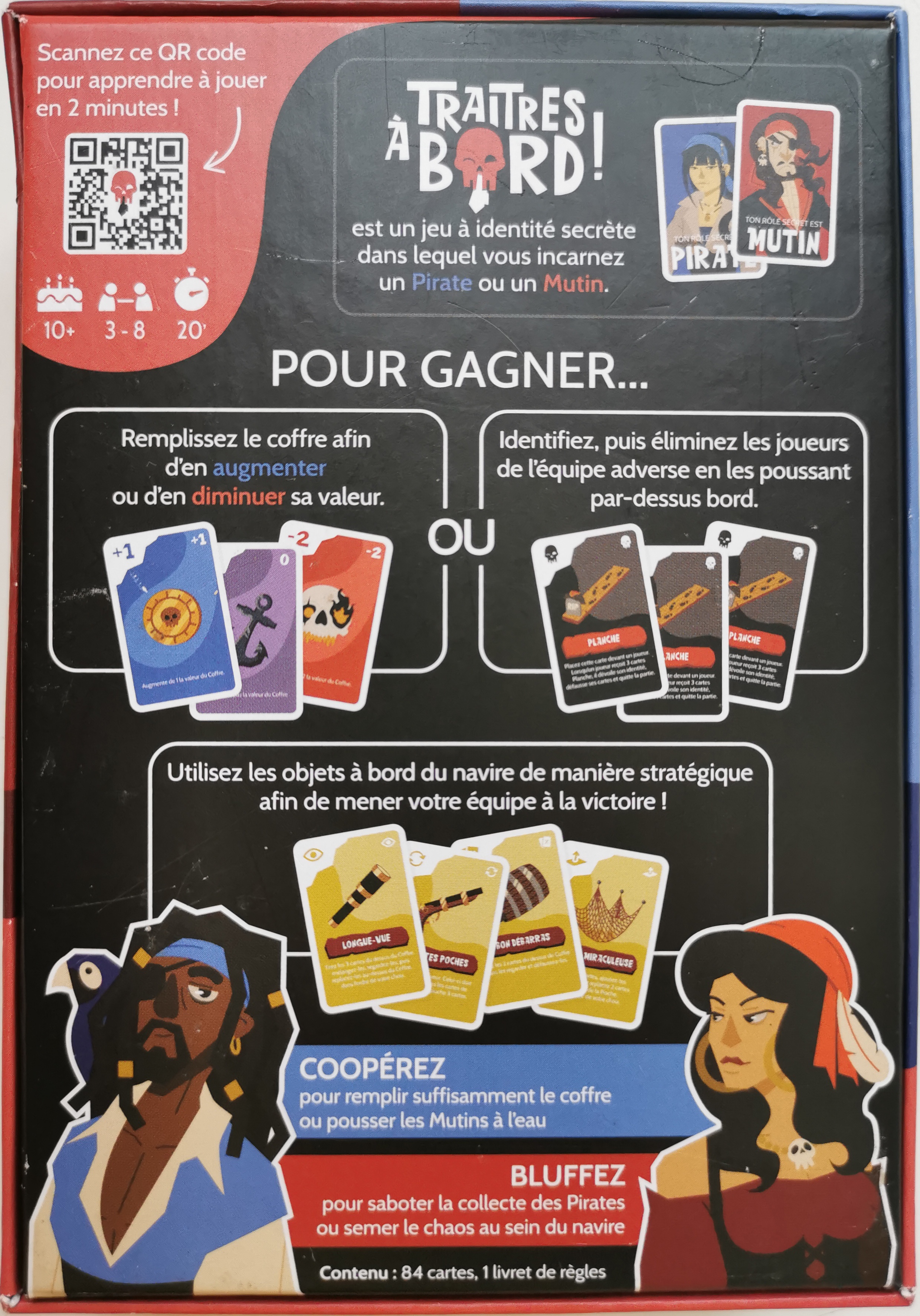 Description : Dans ce jeu, vous incarnerez soit un Pirate déterminé à remplir le coffre de l'équipage, soit un Mutin rusé cherchant à semer le chaos et à saboter la collecte. Le navire deviendra le théâtre d'une confrontation passionnante entre les deux camps ! Pour les Pirates, l'objectif est clair : amasser autant de trésors que possible pour remplir le coffre de l'équipage. Chaque pièce d'or et chaque trésor rapporté renforce la cohésion de l'équipage et rapproche les Pirates de la victoire. Mais attention, car les Mutins sont là pour semer la discorde et le désordre. Leur mission secrète consiste à saboter discrètement la collecte des Pirates, créant ainsi un climat de méfiance et de suspicion à bord du navire. Ils visent à semer le doute parmi les membres de l'équipage, en œuvrant dans l'ombre pour déjouer les plans des Pirates.