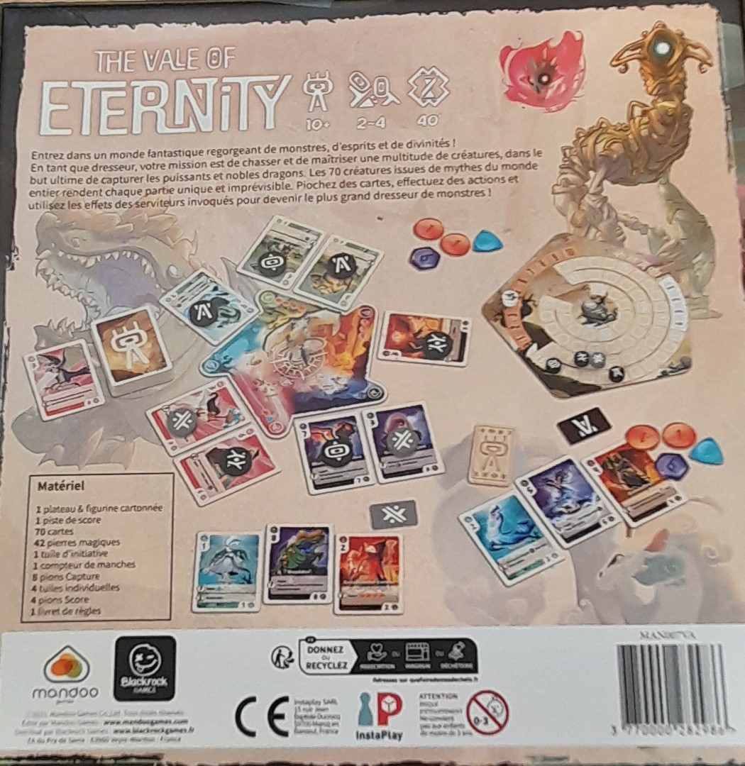 Description : Dans The Vale of Eternity, les joueurs sont des dompteurs qui chassent divers monstres et esprits pour les apprivoiser et en faire des serviteurs. Dans ce monde fantastique, de nombreuses créatures vivent en harmonie. Parmi elles, les dragons sont les plus précieux et les plus nobles, et tous les dompteurs rêvent de les apprivoiser. Le joueur qui réussit à apprivoiser le plus grand nombre de serviteurs gagne.